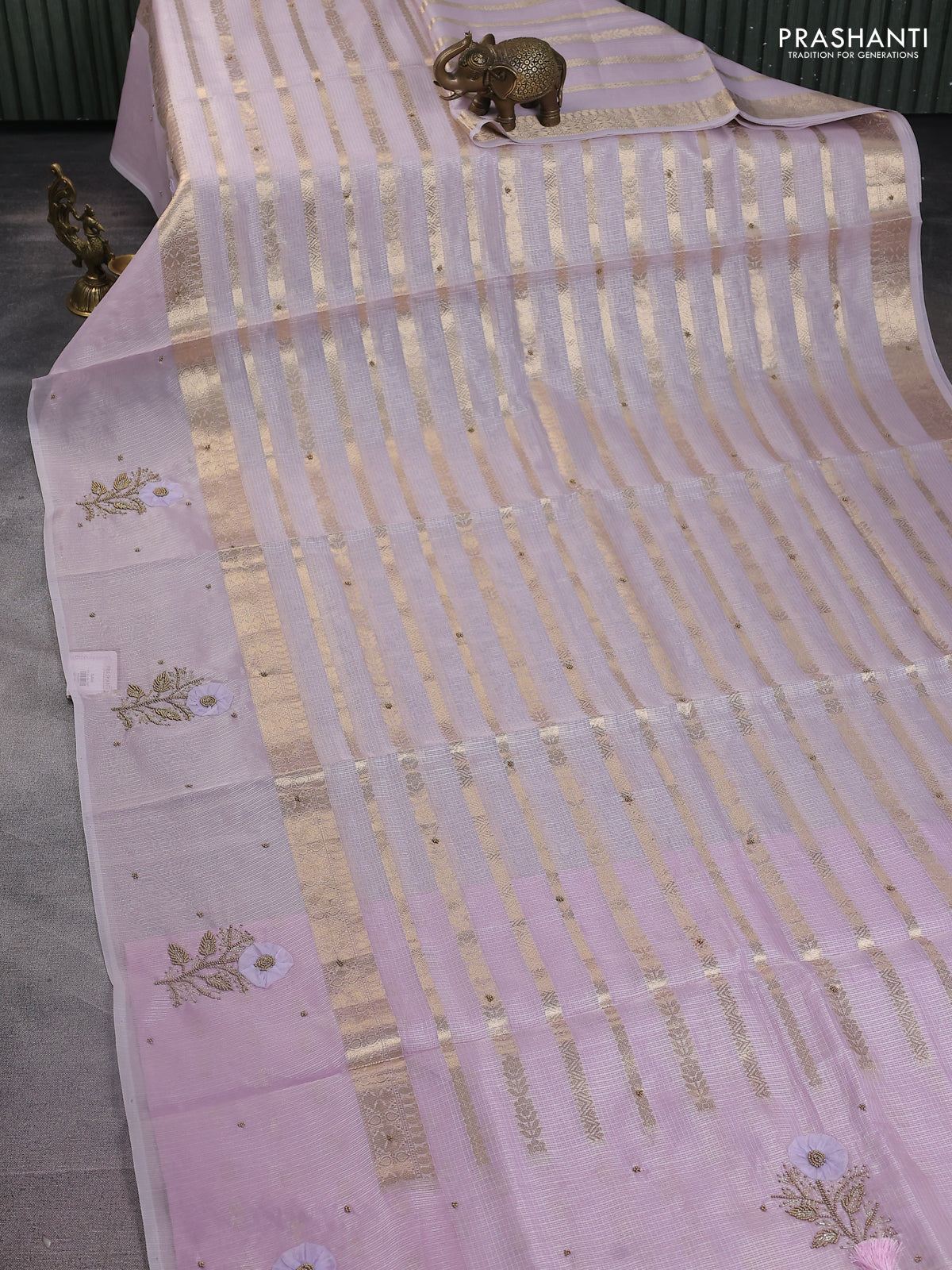 Kota tissue saree mild lavendar with allover zari weaves & embroidery buttas and zari woven embroidery butta border