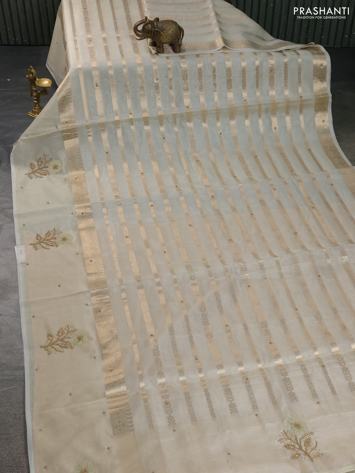Kota tissue saree mild pista green and sandal with allover zari weaves & embroidery buttas and zari woven embroidery butta border
