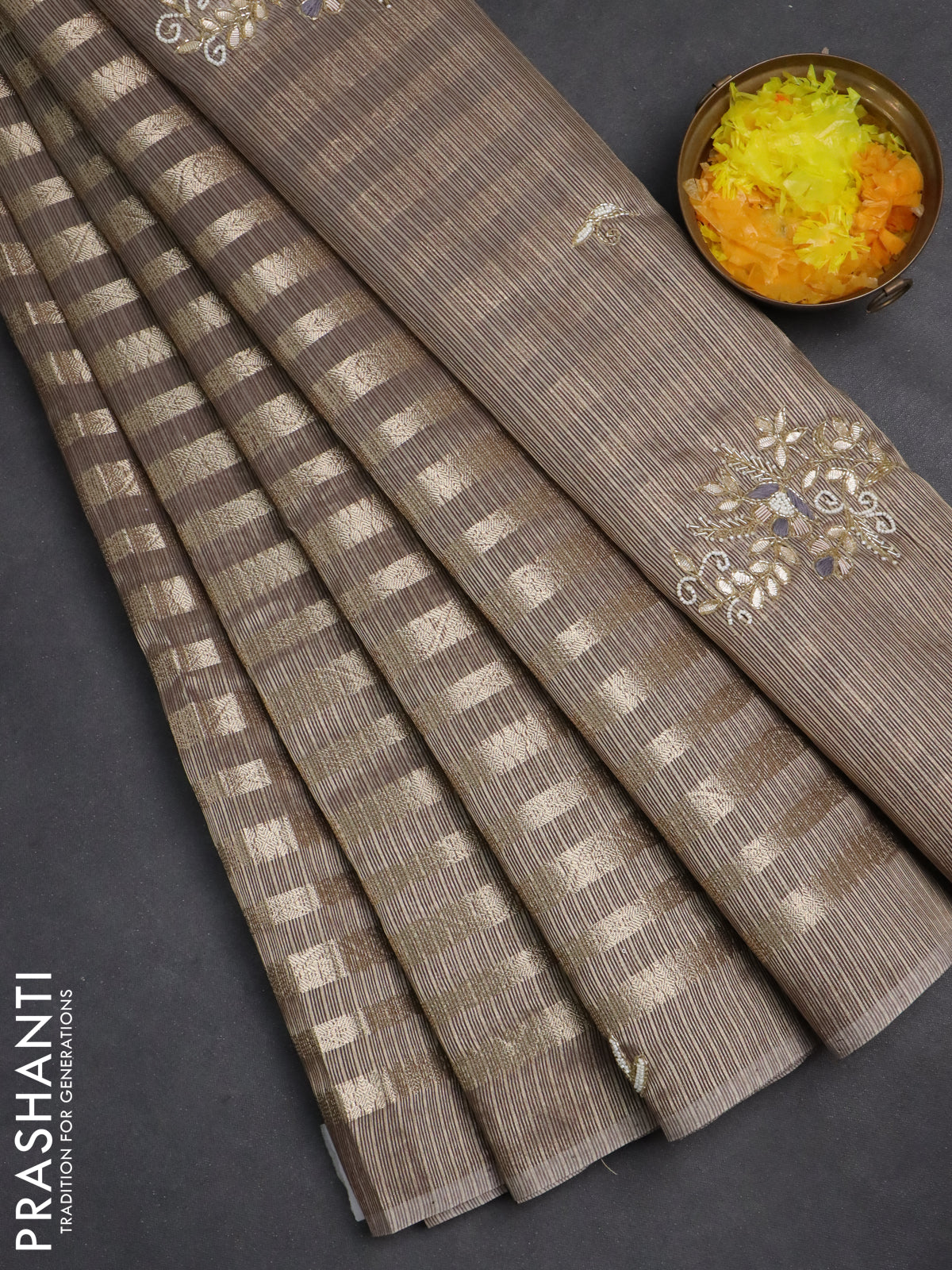 Kota tissue saree pastel brown with allover zari weaves and embroidery butta border
