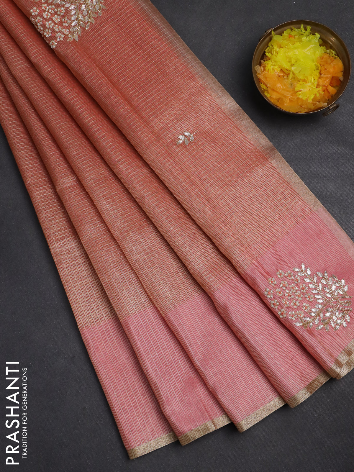 Kota tissue saree peach shade with allover zari weaves embroidery buttas and embroidery butta border