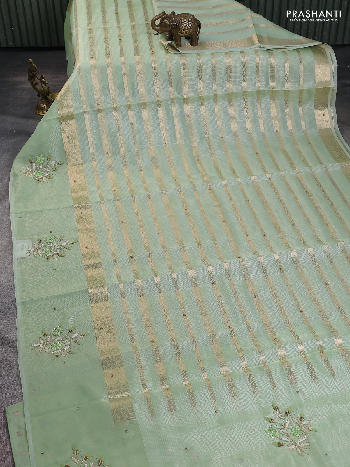 Kota tissue saree pista green with allover zari weaves & embroidery buttas and embroidery butta border
