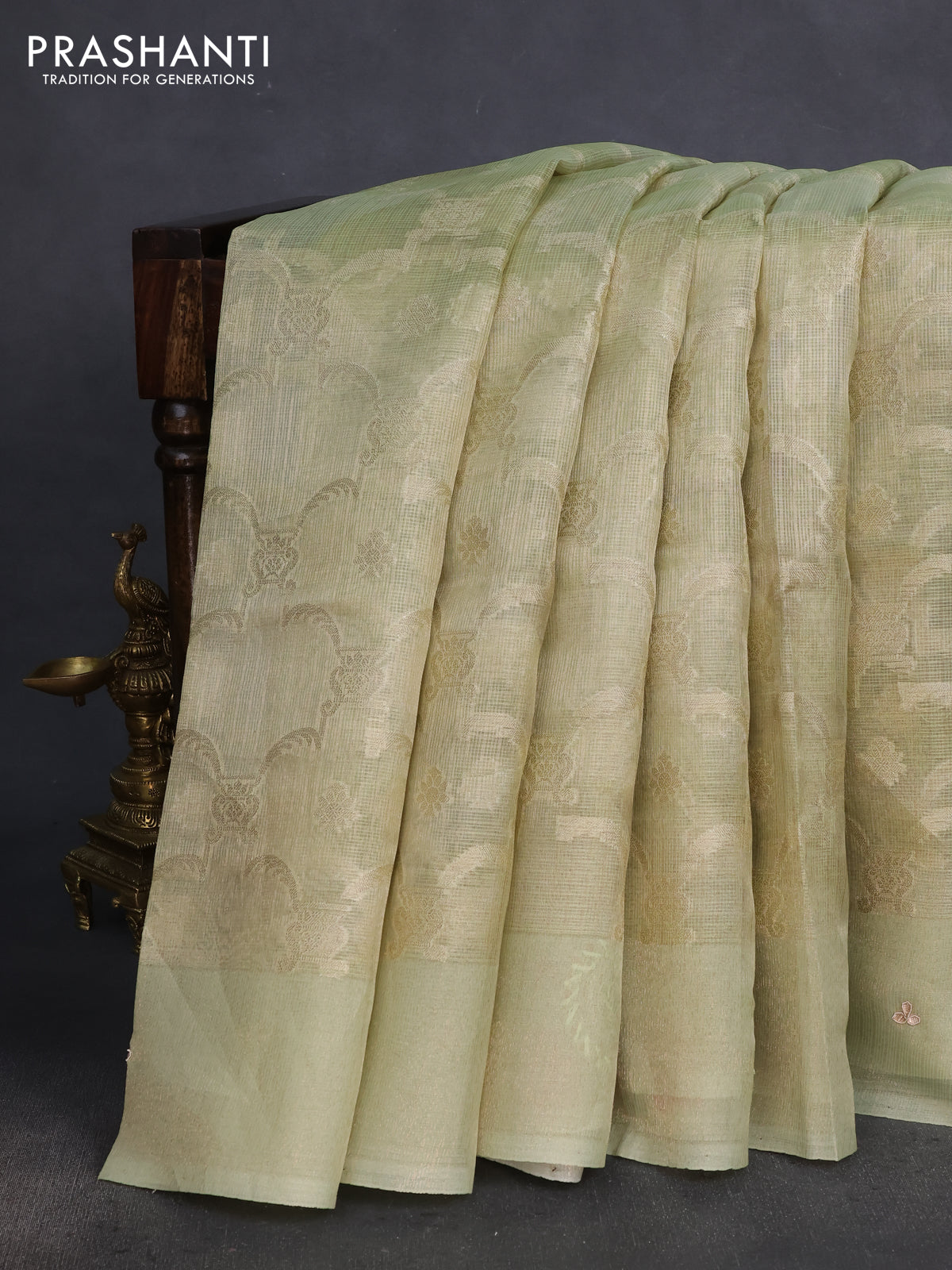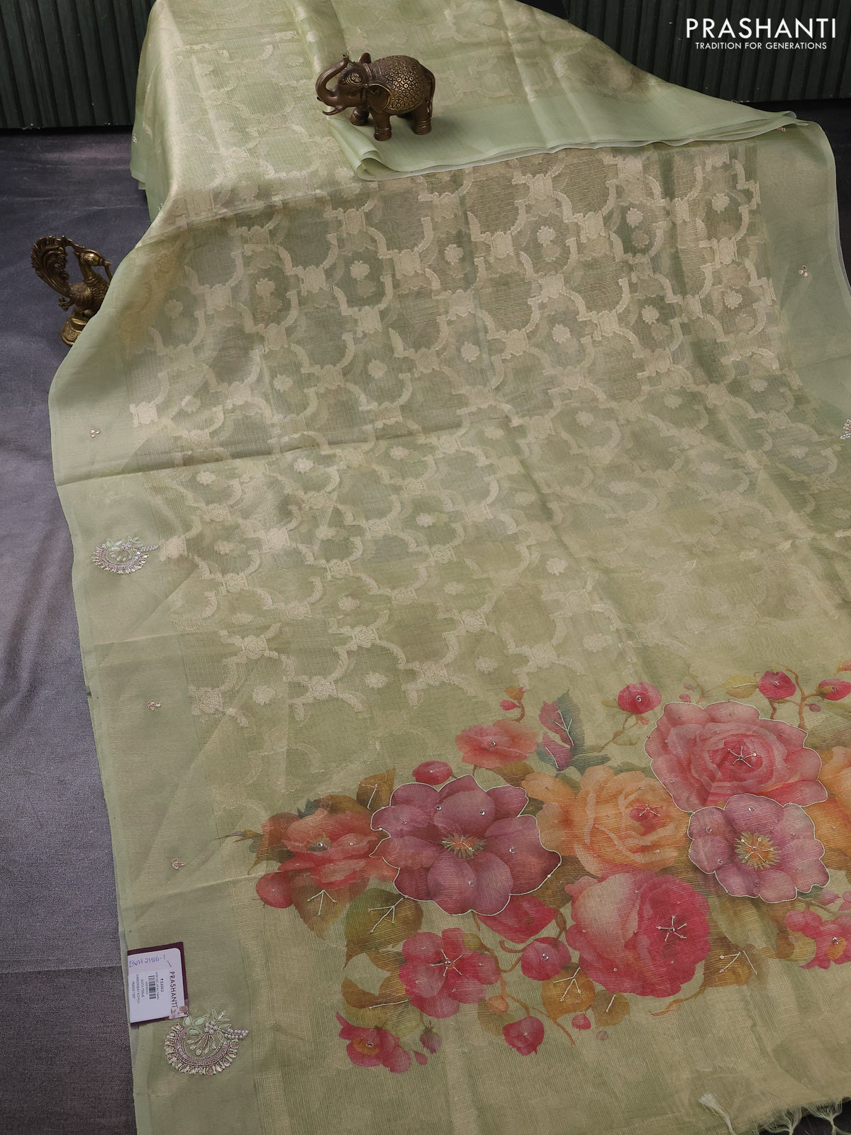 Kota tissue saree pista green with floral prints & pita work and zardosi work butta border