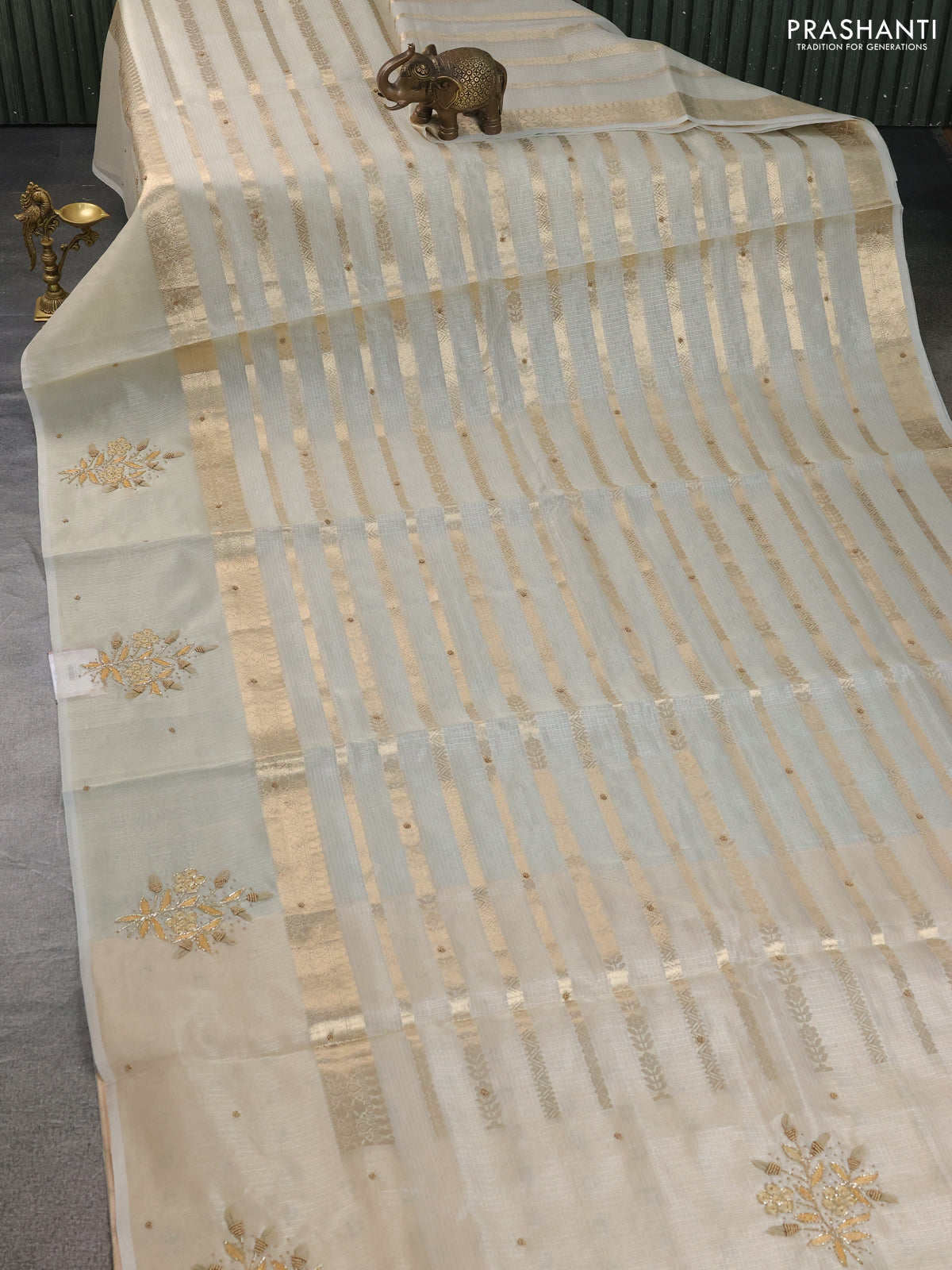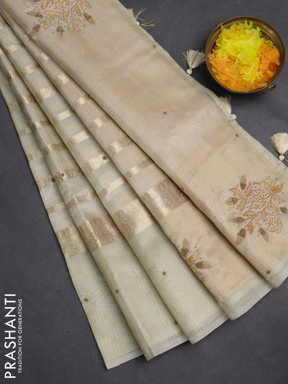 Kota tissue saree sandal with allover zari weaves & embroidery buttas and embroidery butta border