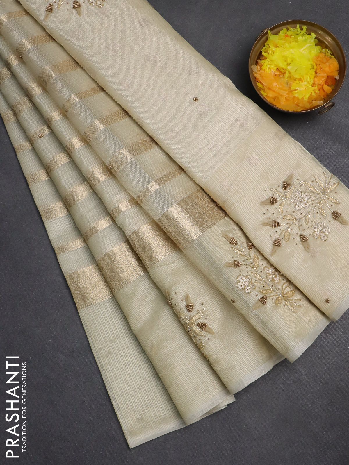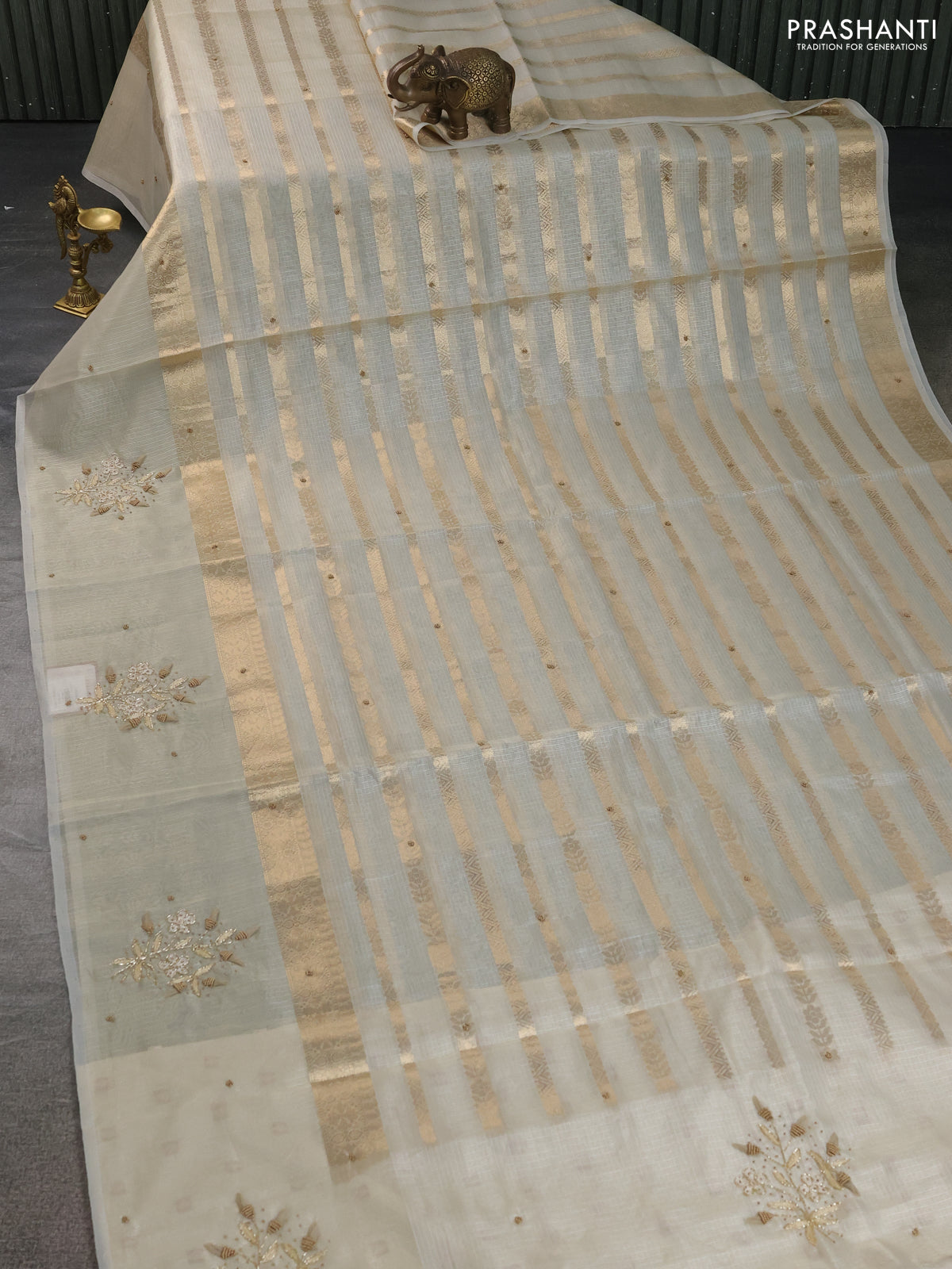 Kota tissue saree sandal with allover zari weaves & embroidery buttas and embroidery butta border
