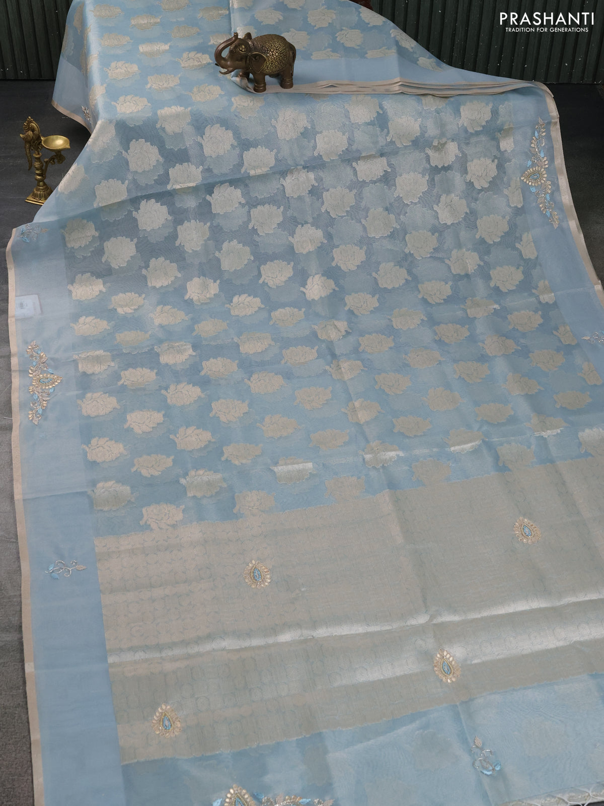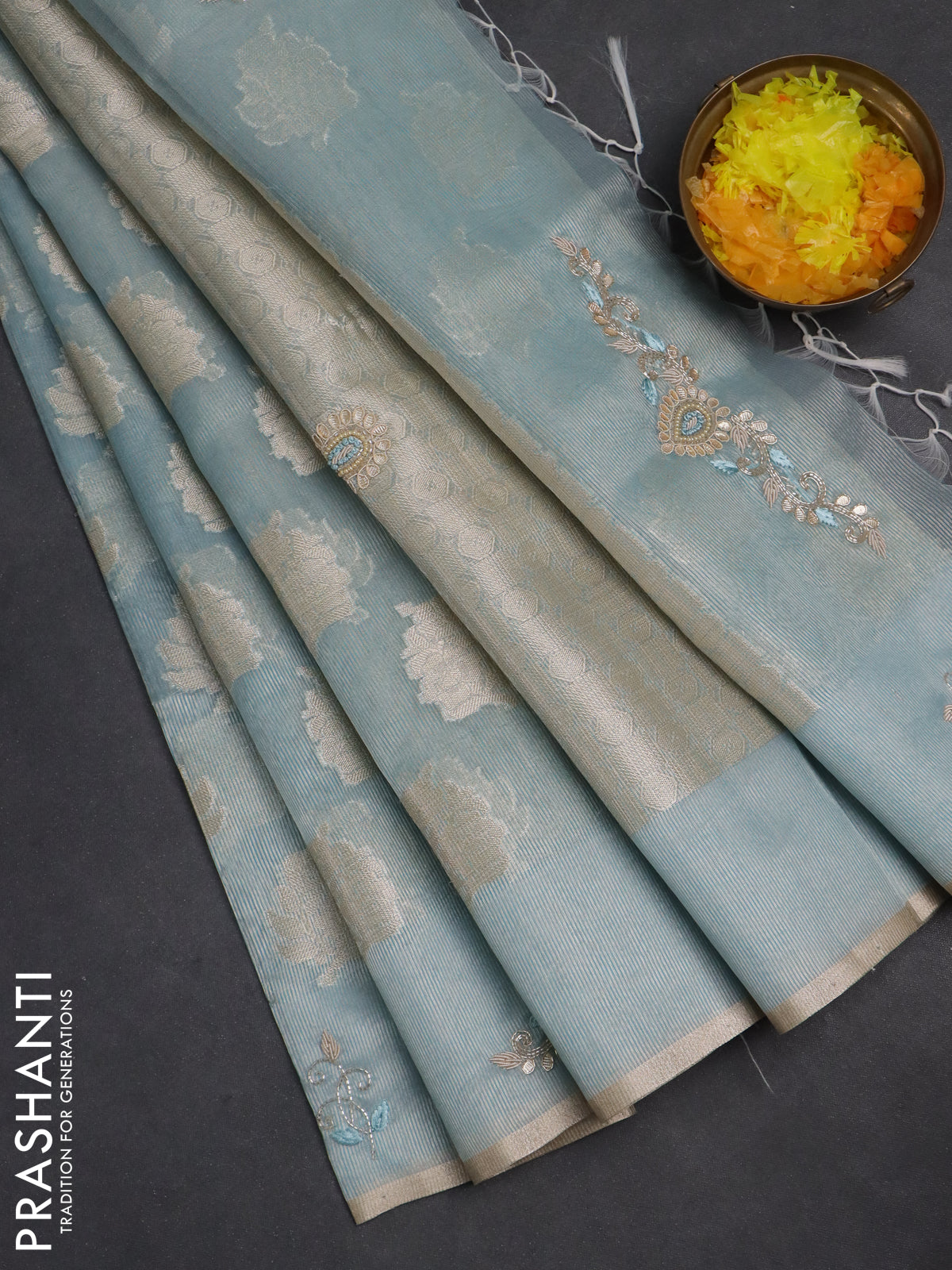 Kota tissue saree teal blue with zari woven floral buttas and embroidery butta border