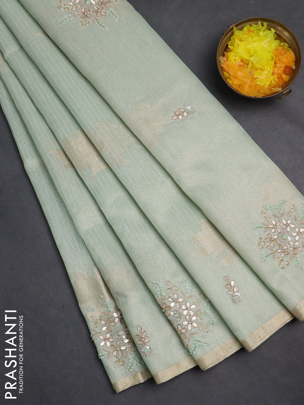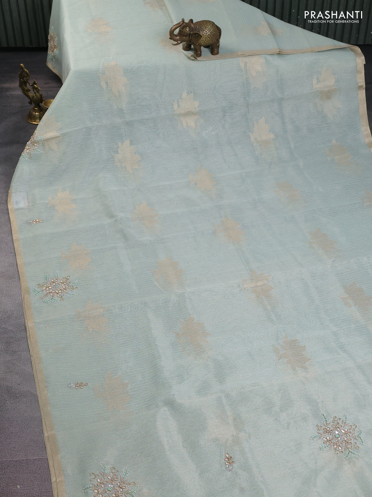 Kota tissue saree teal blue with zari woven floral buttas and embroidery butta border