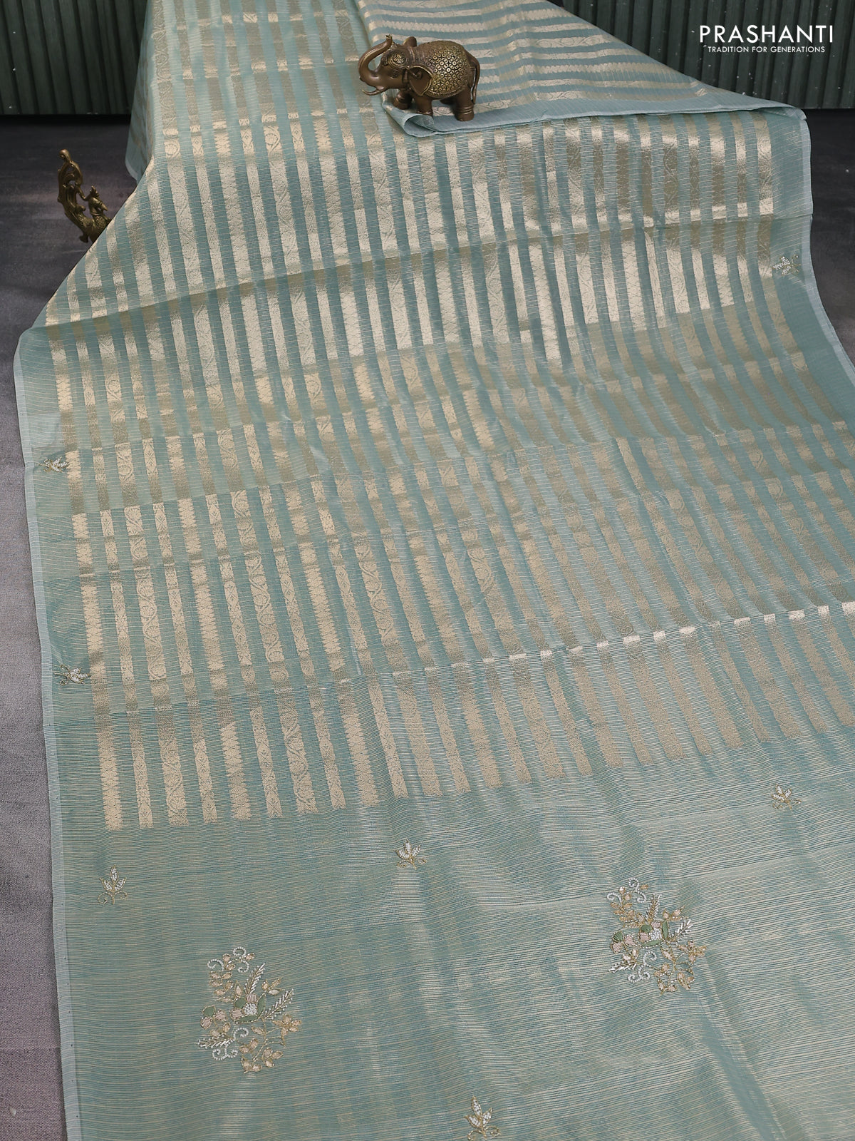 Kota tissue saree teal green with allover zari weaves and embroidery butta border