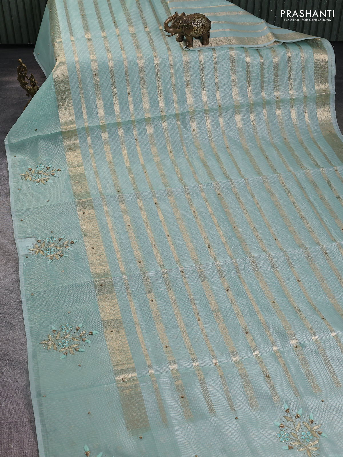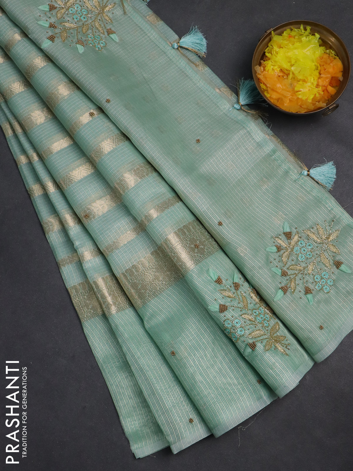 Kota tissue saree teal green with allover zari weaves & embroidery buttas and embroidery butta border
