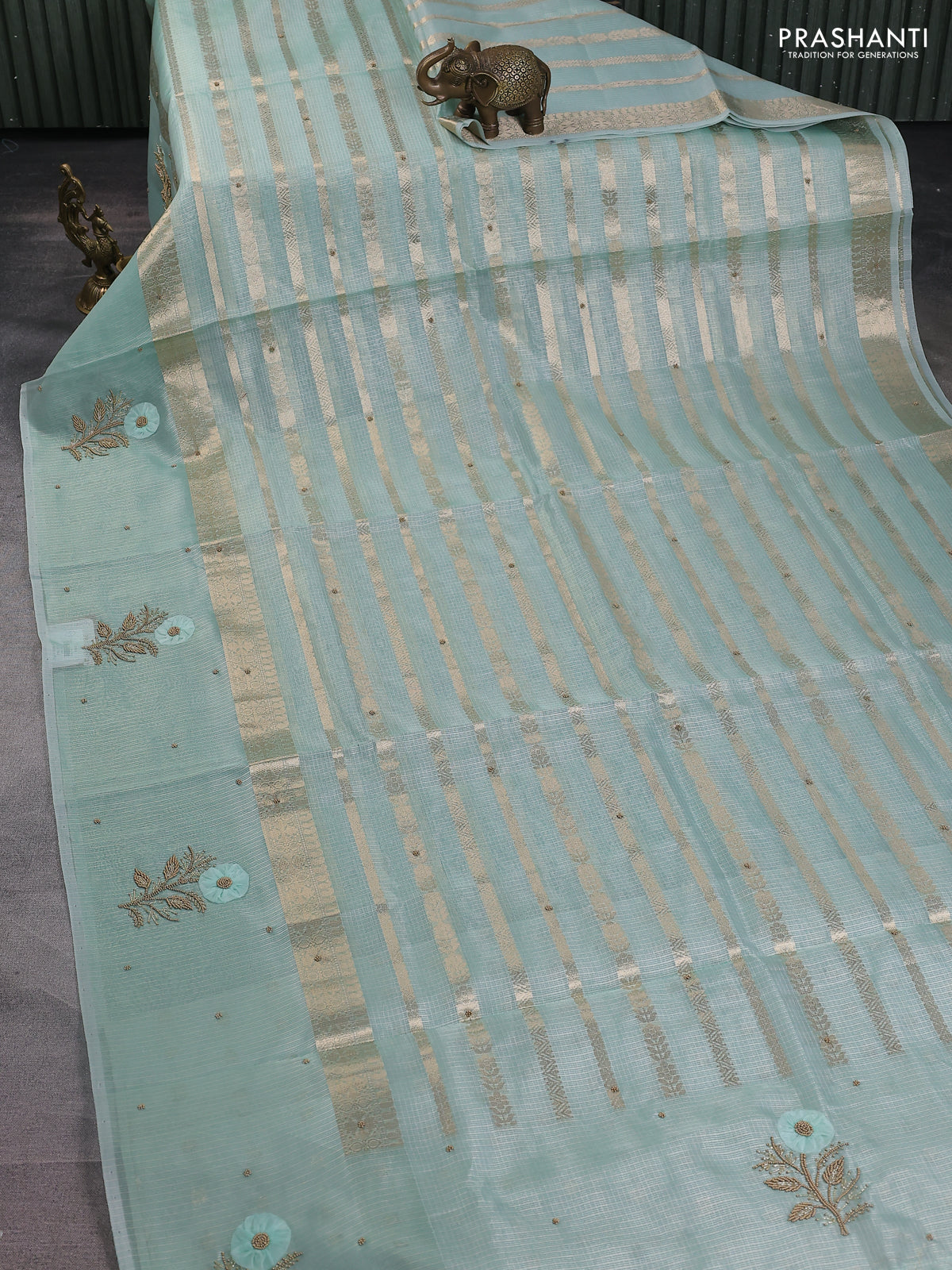 Kota tissue saree teal green with allover zari weaves & embroidery buttas and zari woven embroidery butta border