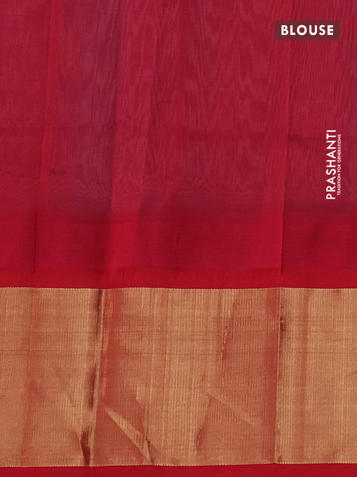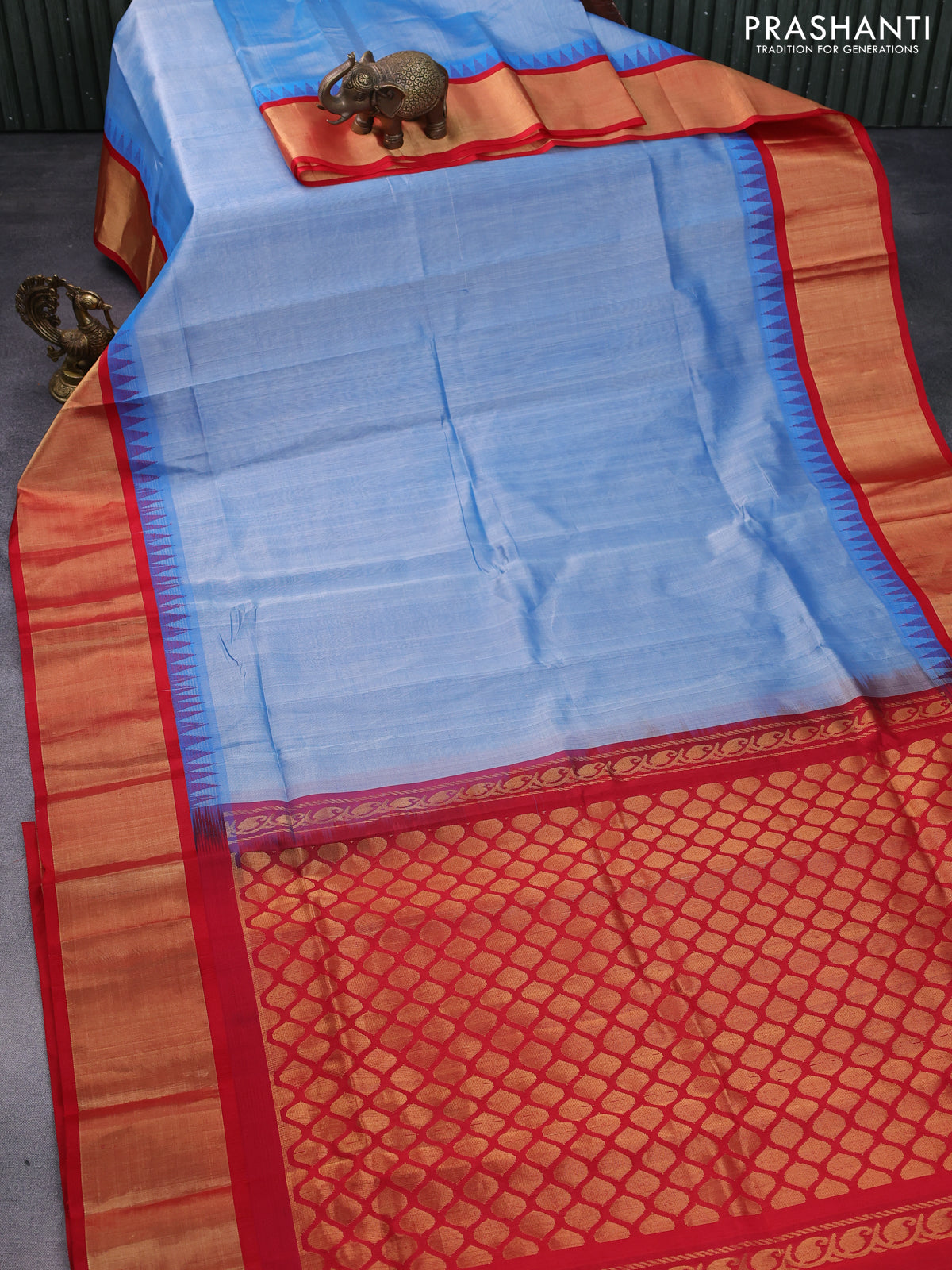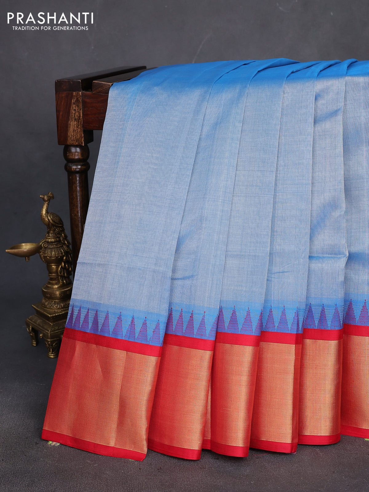 Kuppadam silk cotton saree blue shade and red with plain body and temple design zari woven border