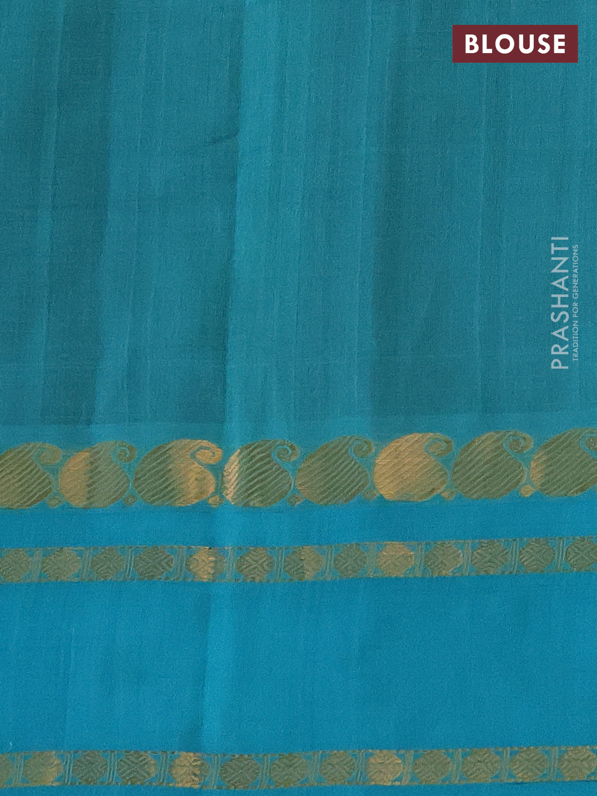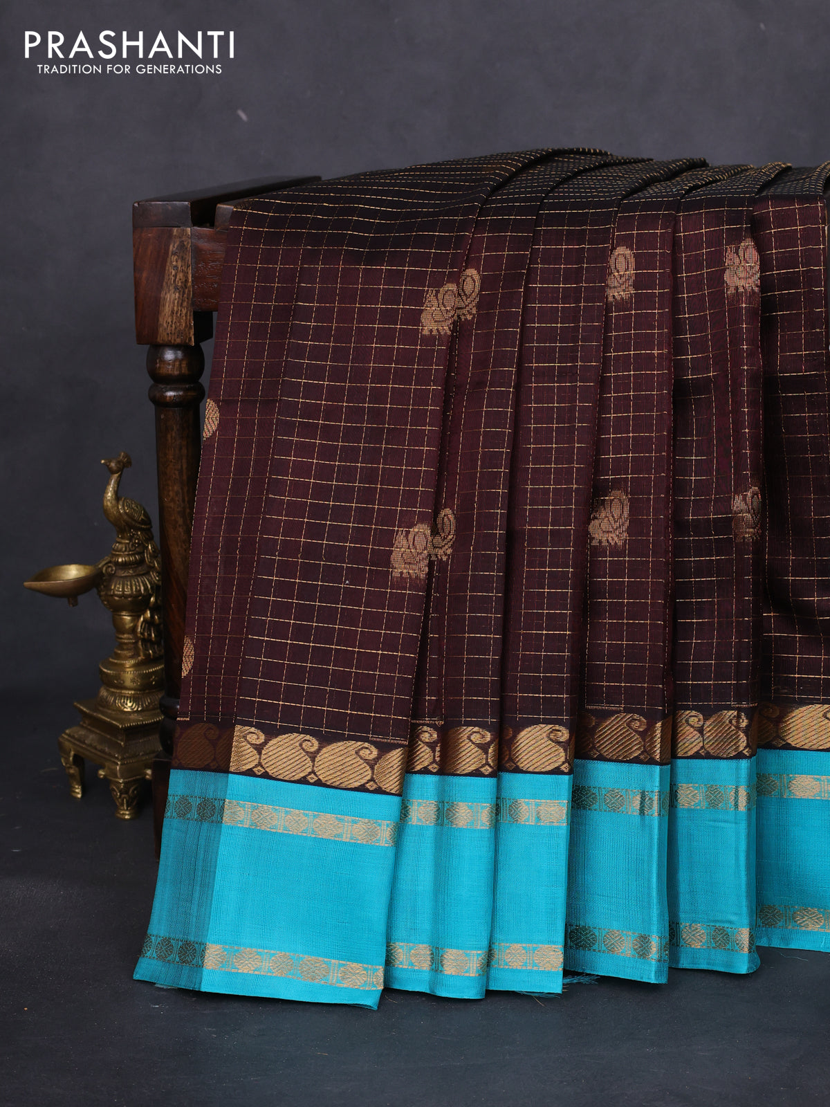 Kuppadam silk cotton saree brown and teal blue with allover zari checks & rudhraksha annam buttas and paisley zari woven border