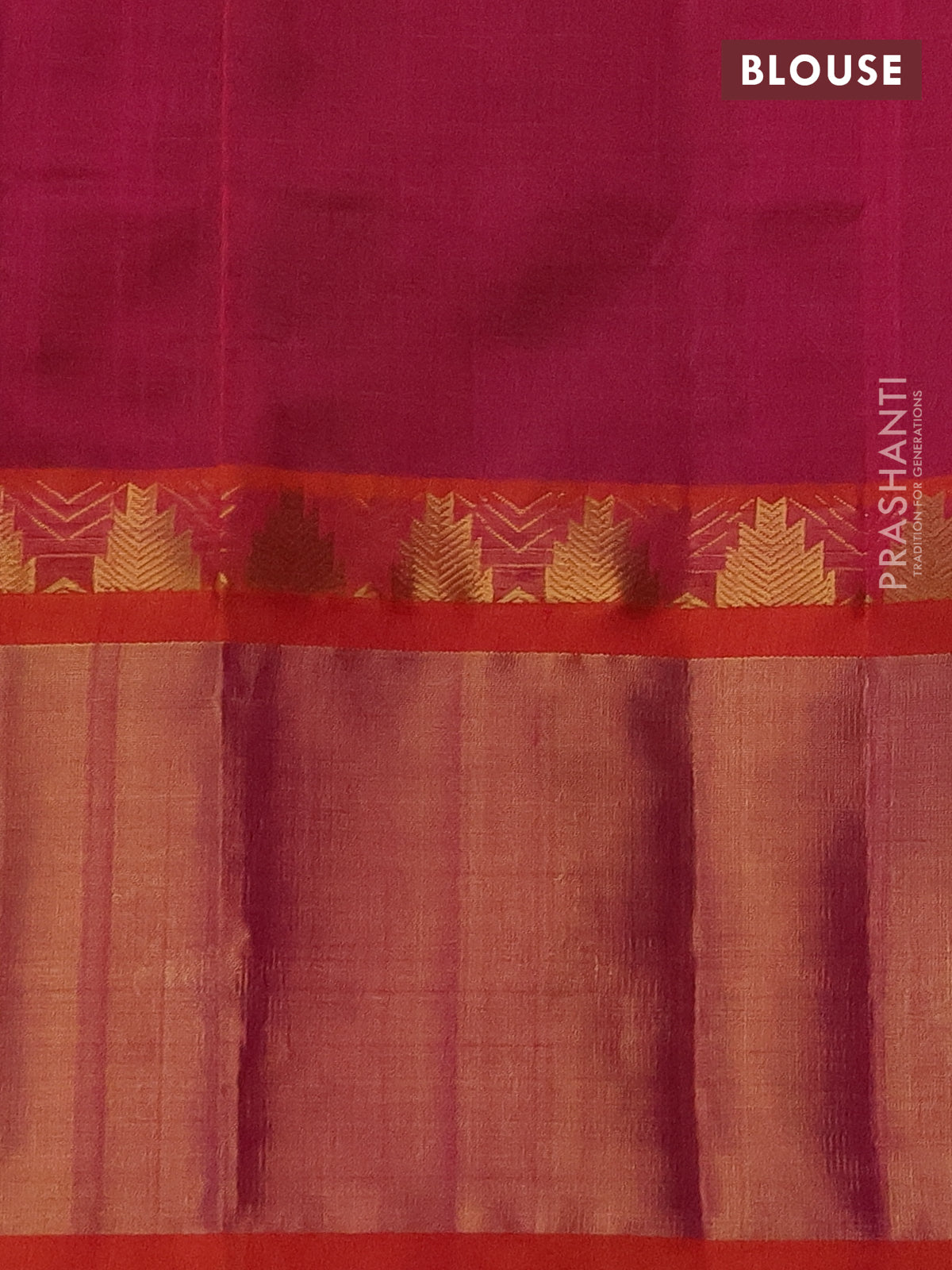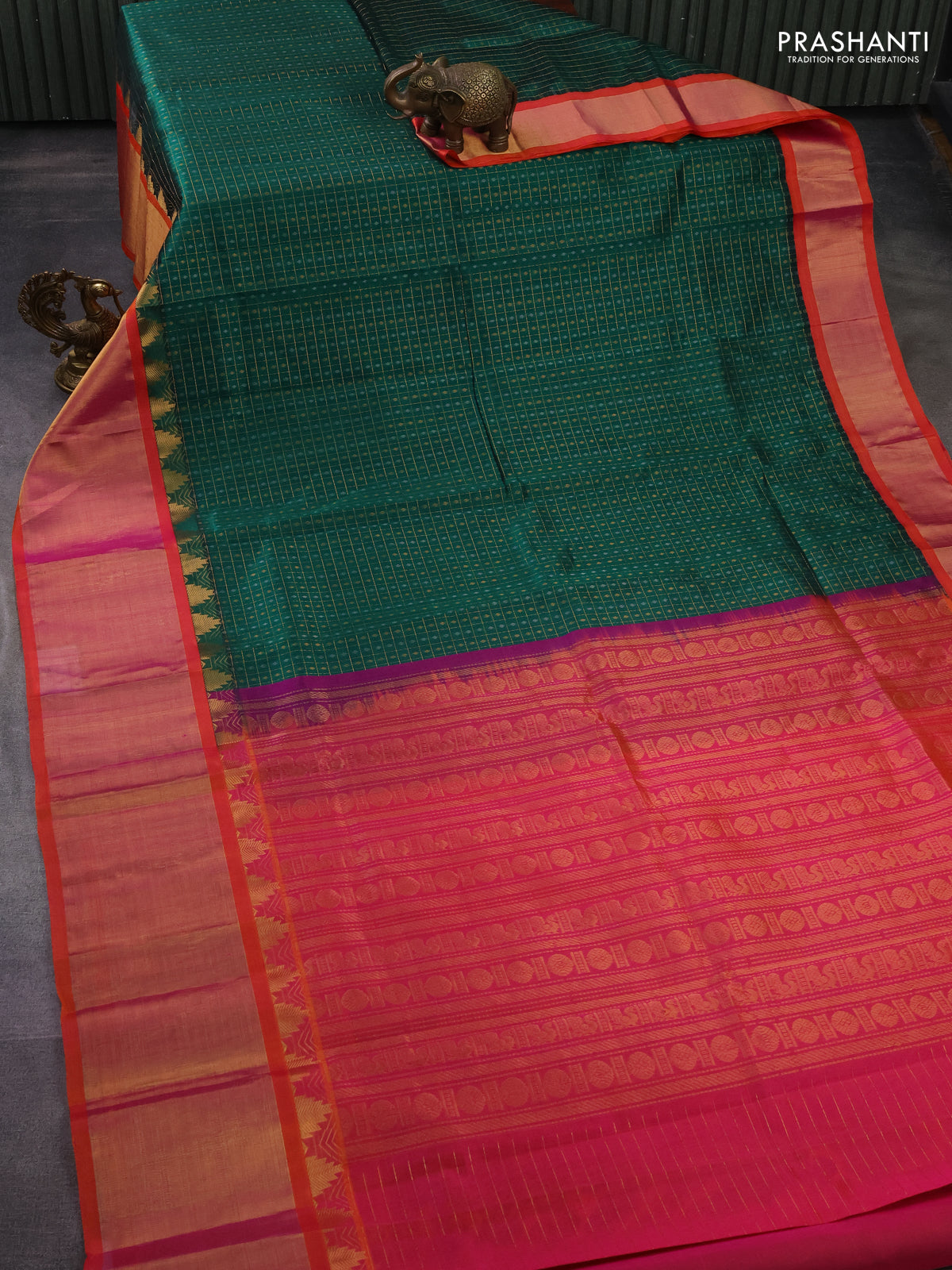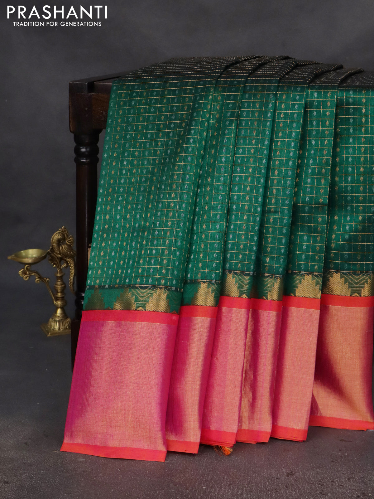 Kuppadam silk cotton saree green and dual shade of pinkish orange with allover small zari checks & lakshadeepam weaves and temple design long zari woven border
