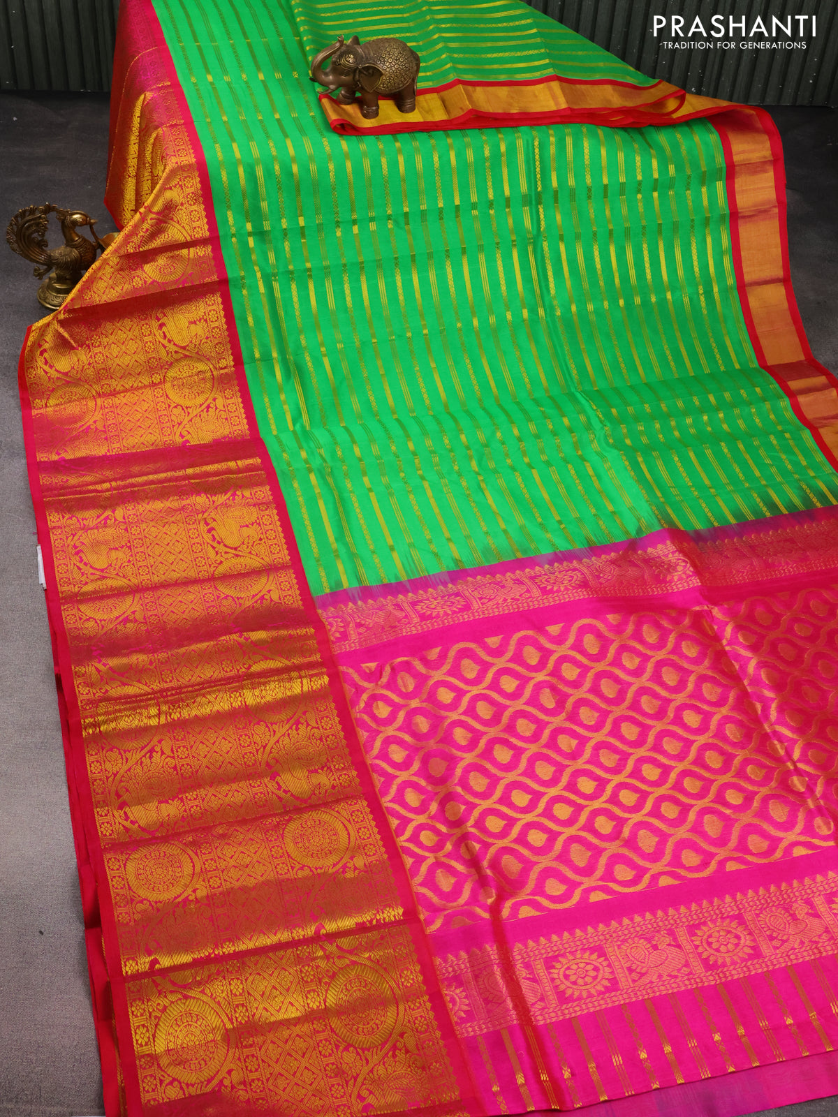 Kuppadam silk cotton saree green and pink with allover zari stripes pattern and long zari woven border
