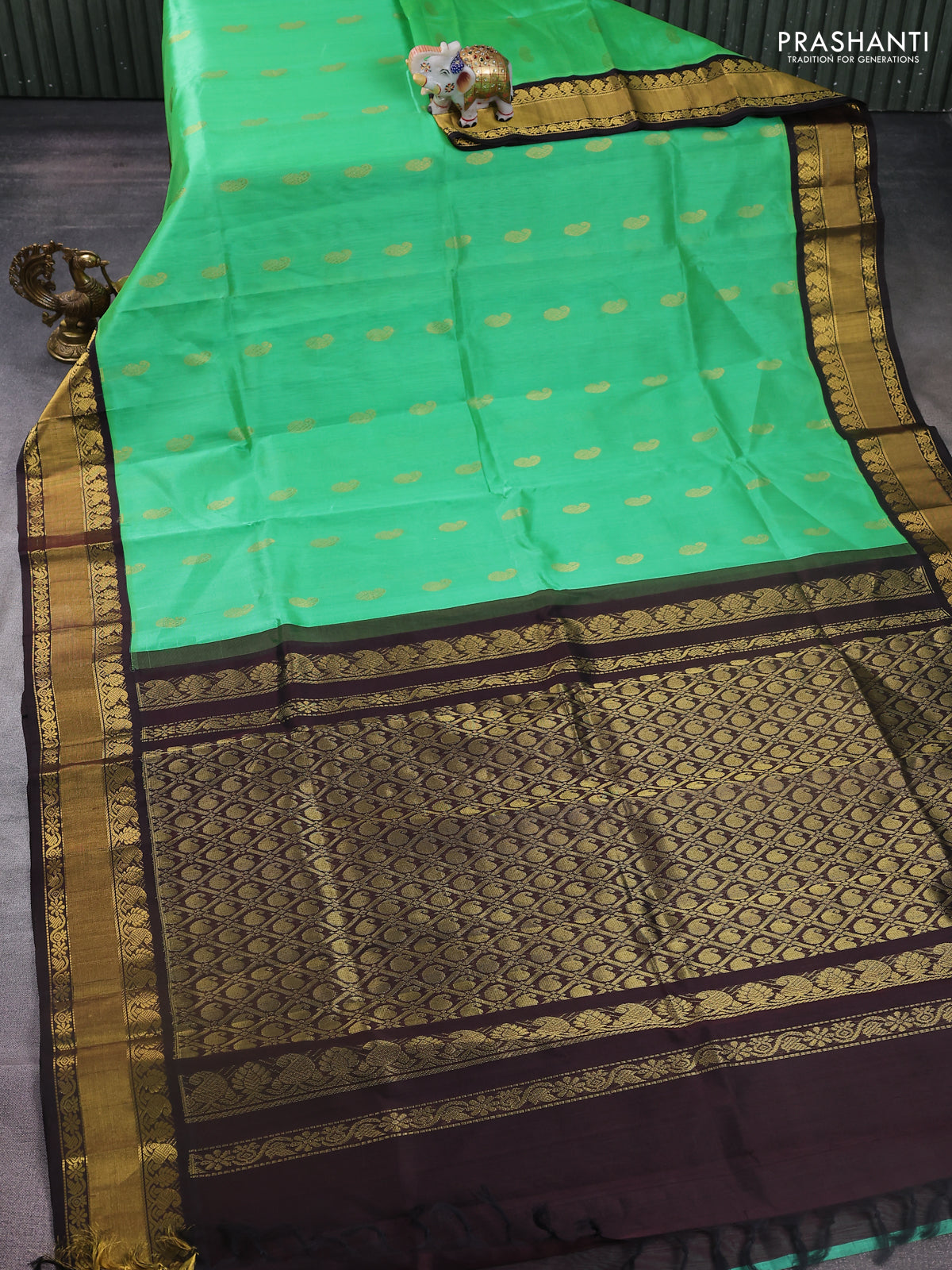 Kuppadam silk cotton saree light green and coffee brown with paisley zari woven buttas and zari woven border