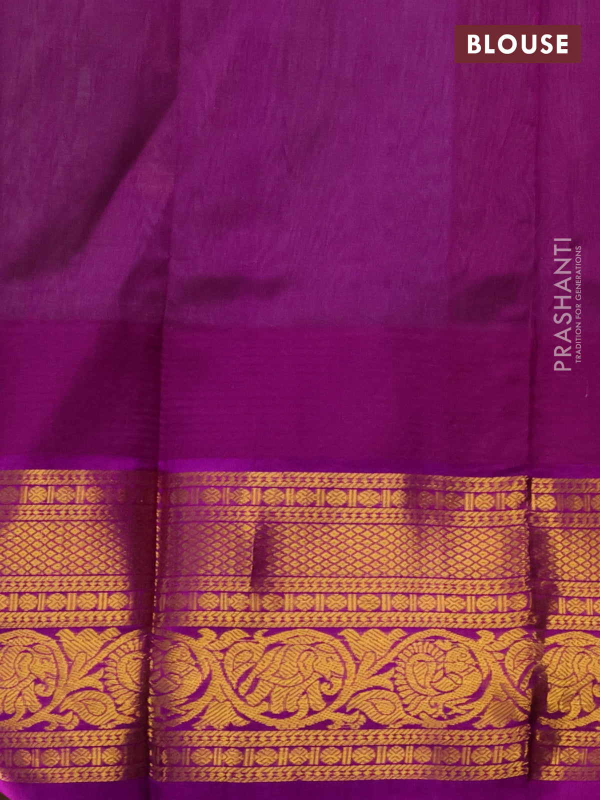 Kuppadam silk cotton saree light green and purple with zari woven buttas and temple design zari woven border