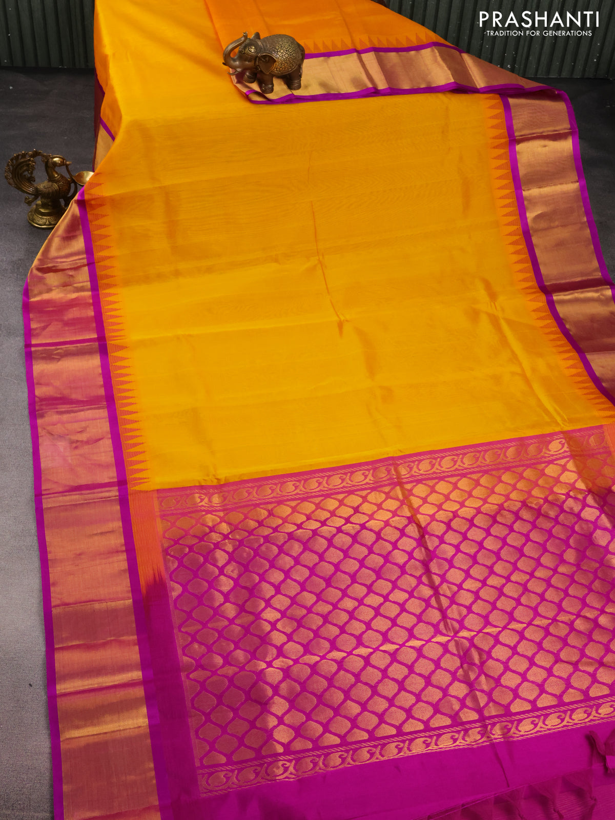 Kuppadam silk cotton saree mango yellow and purple with plain body and temple design zari woven border