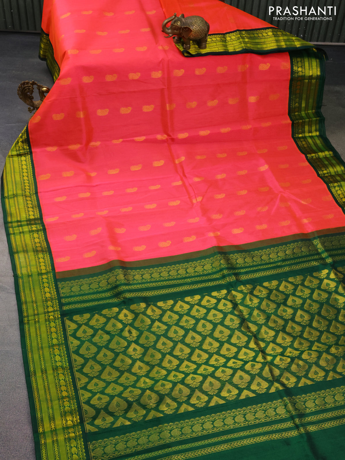 Kuppadam silk cotton saree peach pink and dark green with zari woven paisley buttas and zari woven border