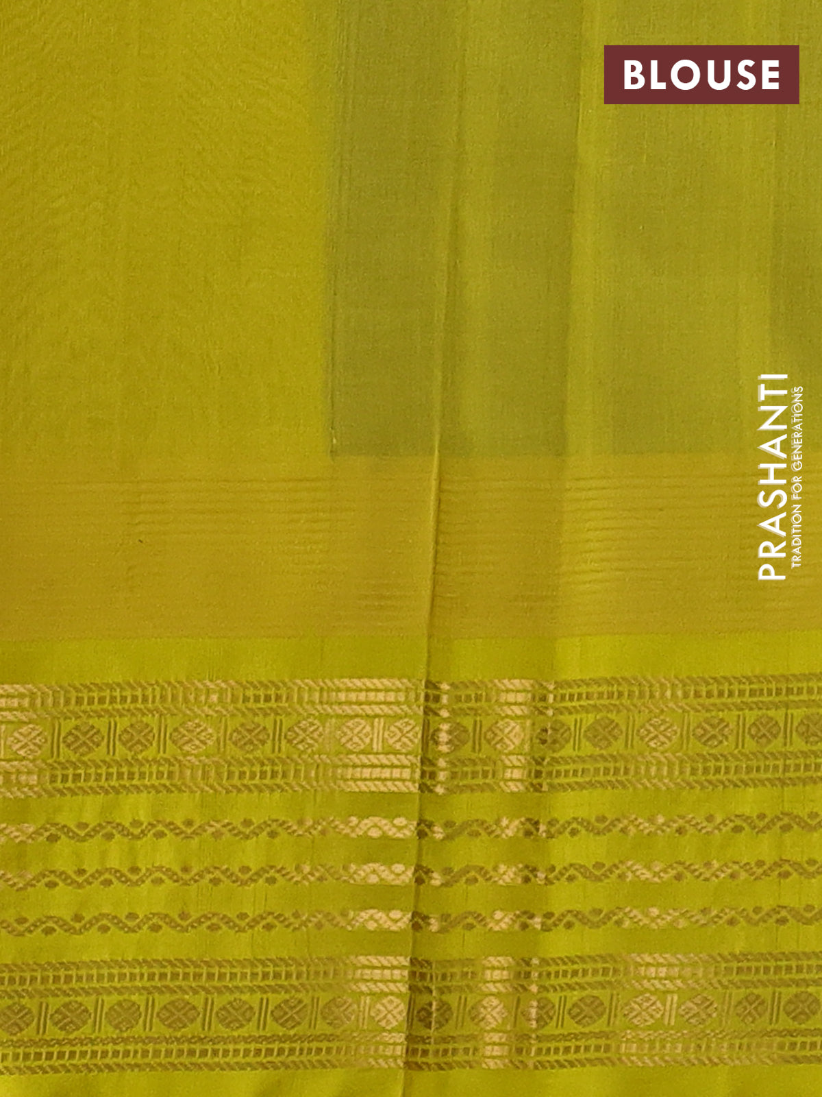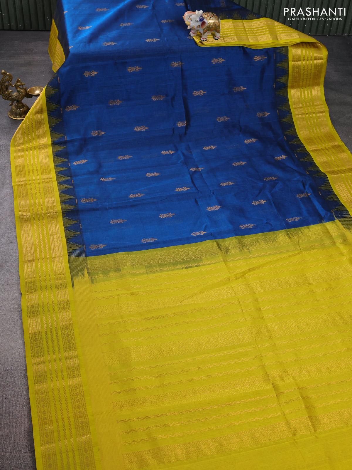 Kuppadam silk cotton saree peacock blue and lime yellow with zari woven buttas and temple design zari woven border