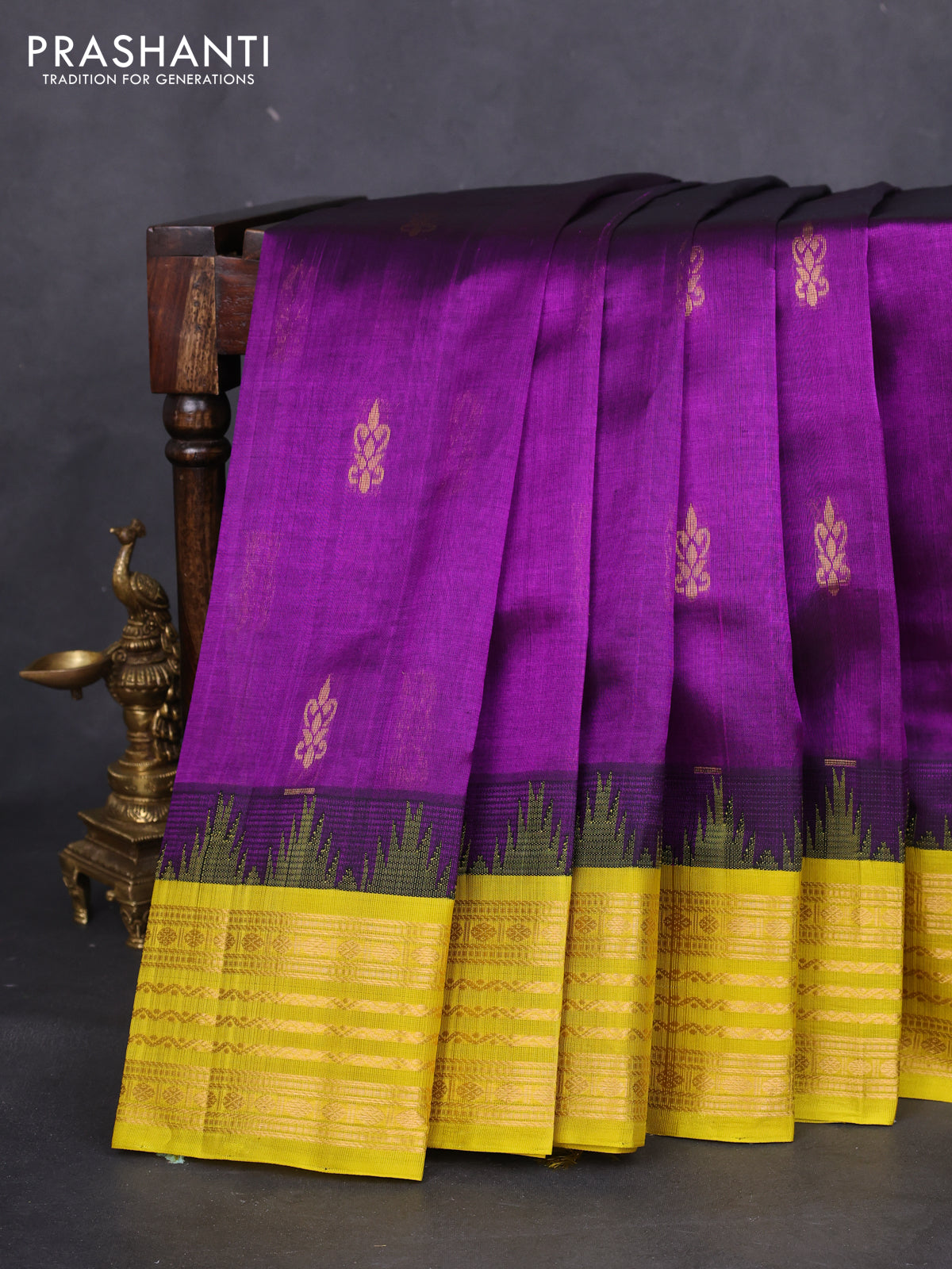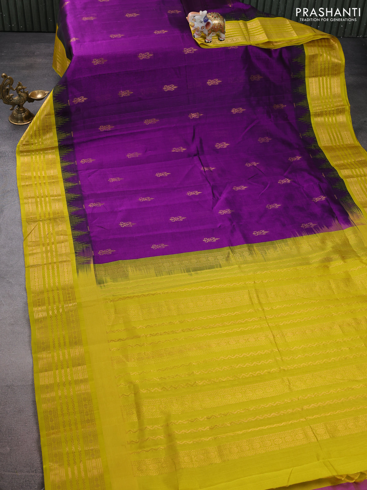 Kuppadam silk cotton saree purple and lime yellow with zari woven buttas and temple design zari woven border
