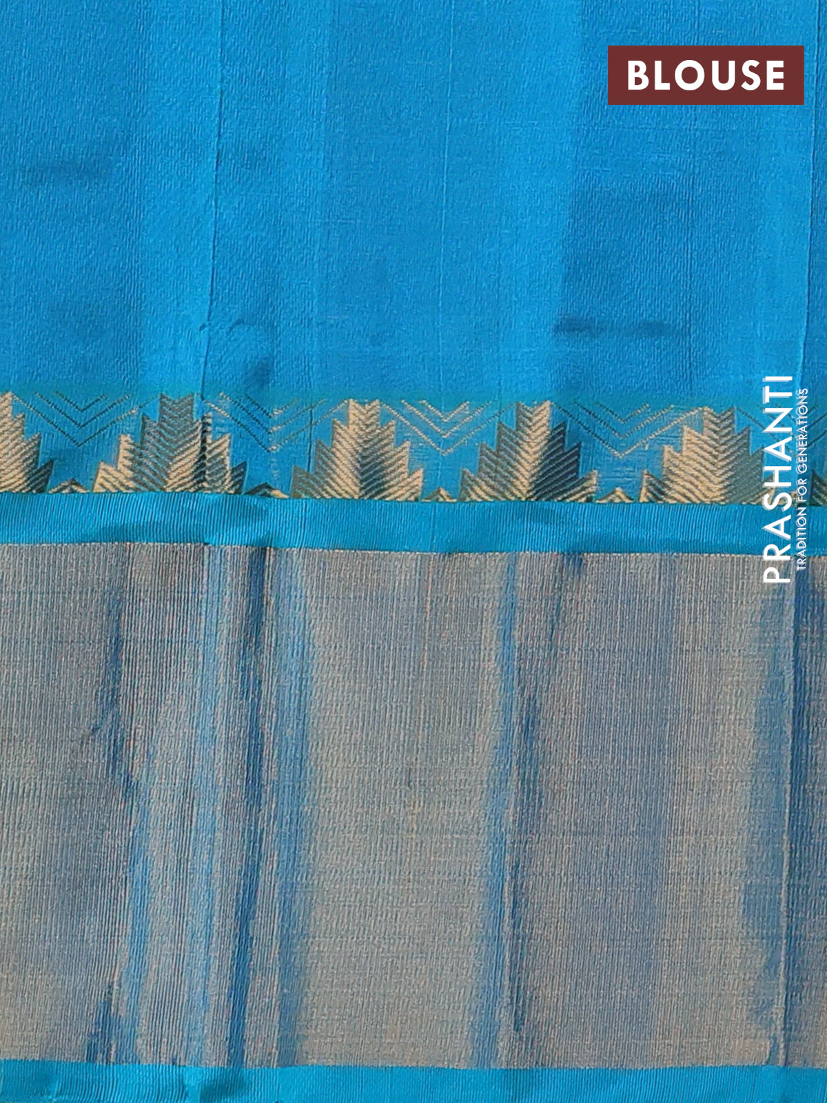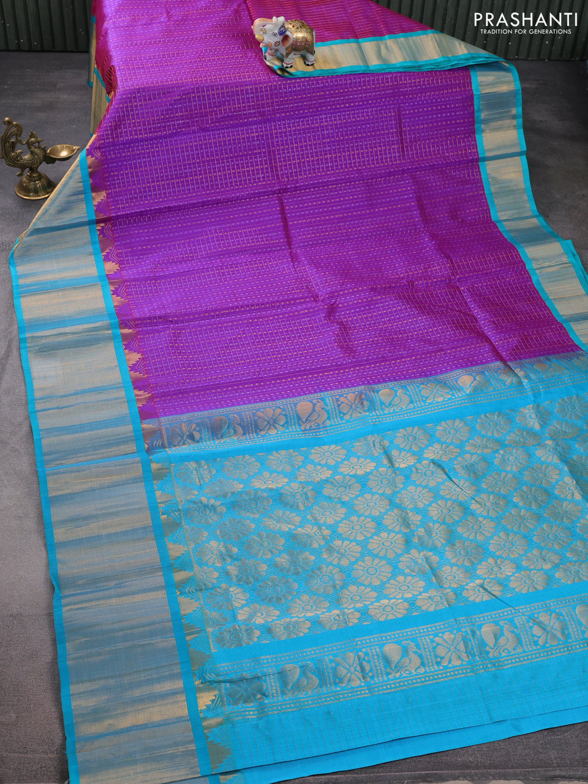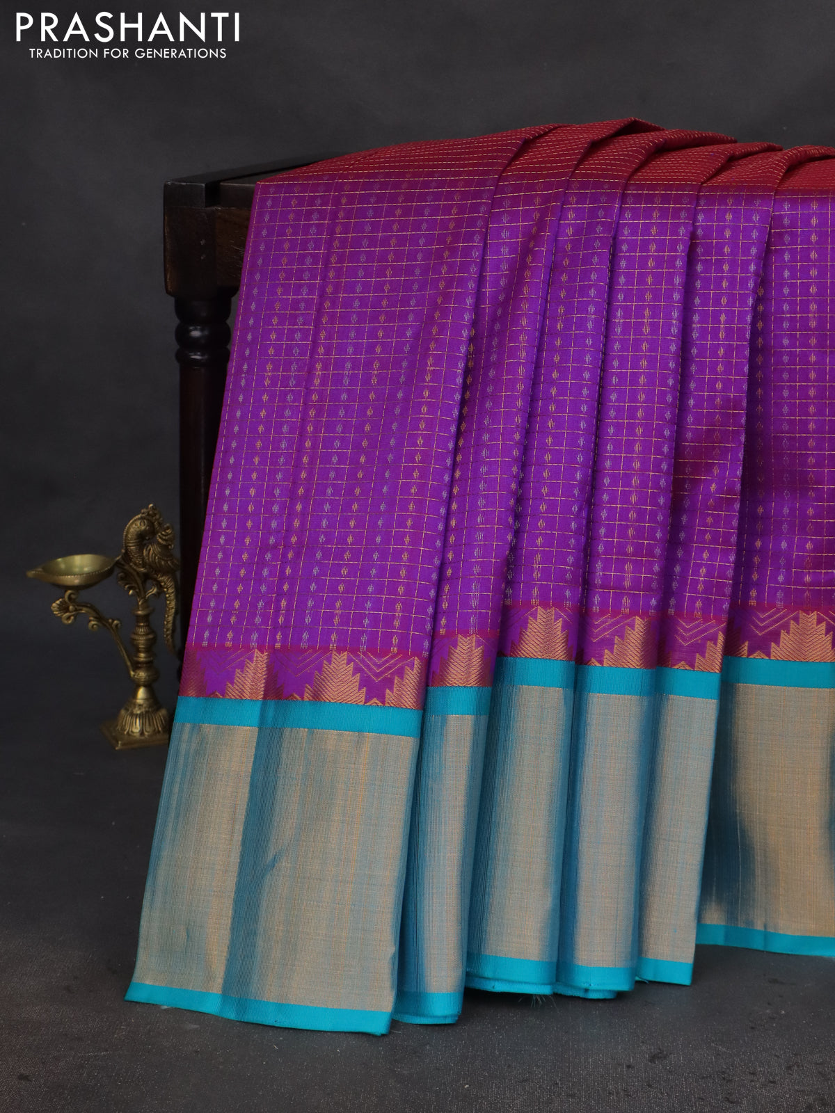 Kuppadam silk cotton saree purple and teal blue with allover small zari checks & lakshadeepam weaves and temple design long zari woven border