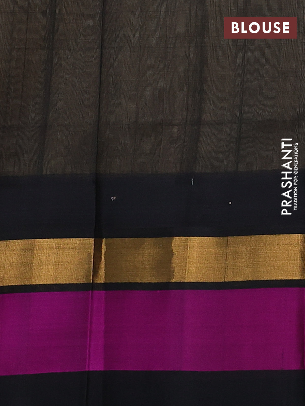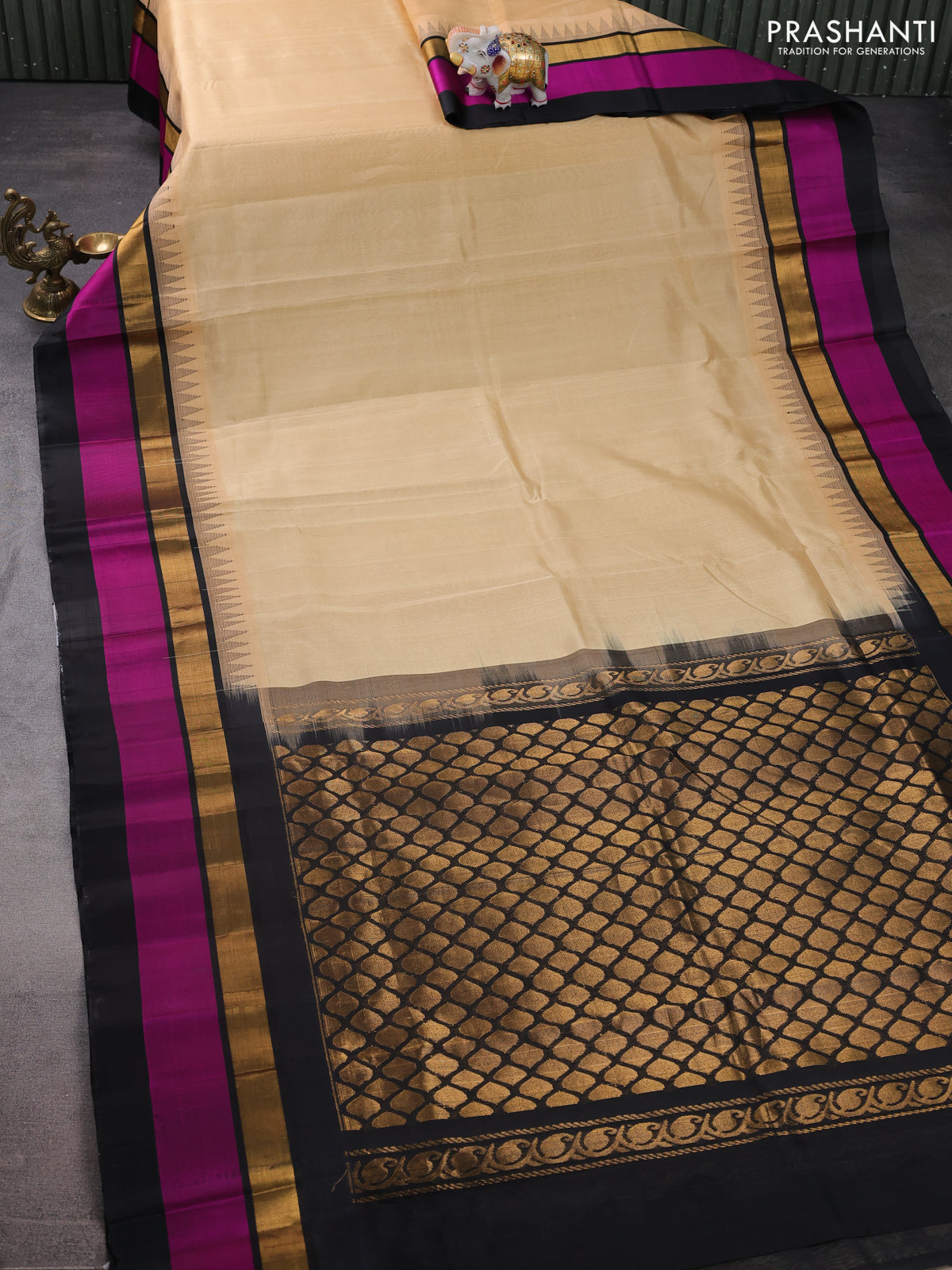 Kuppadam silk cotton saree sandal and black with plain body and temple design zari woven simple border