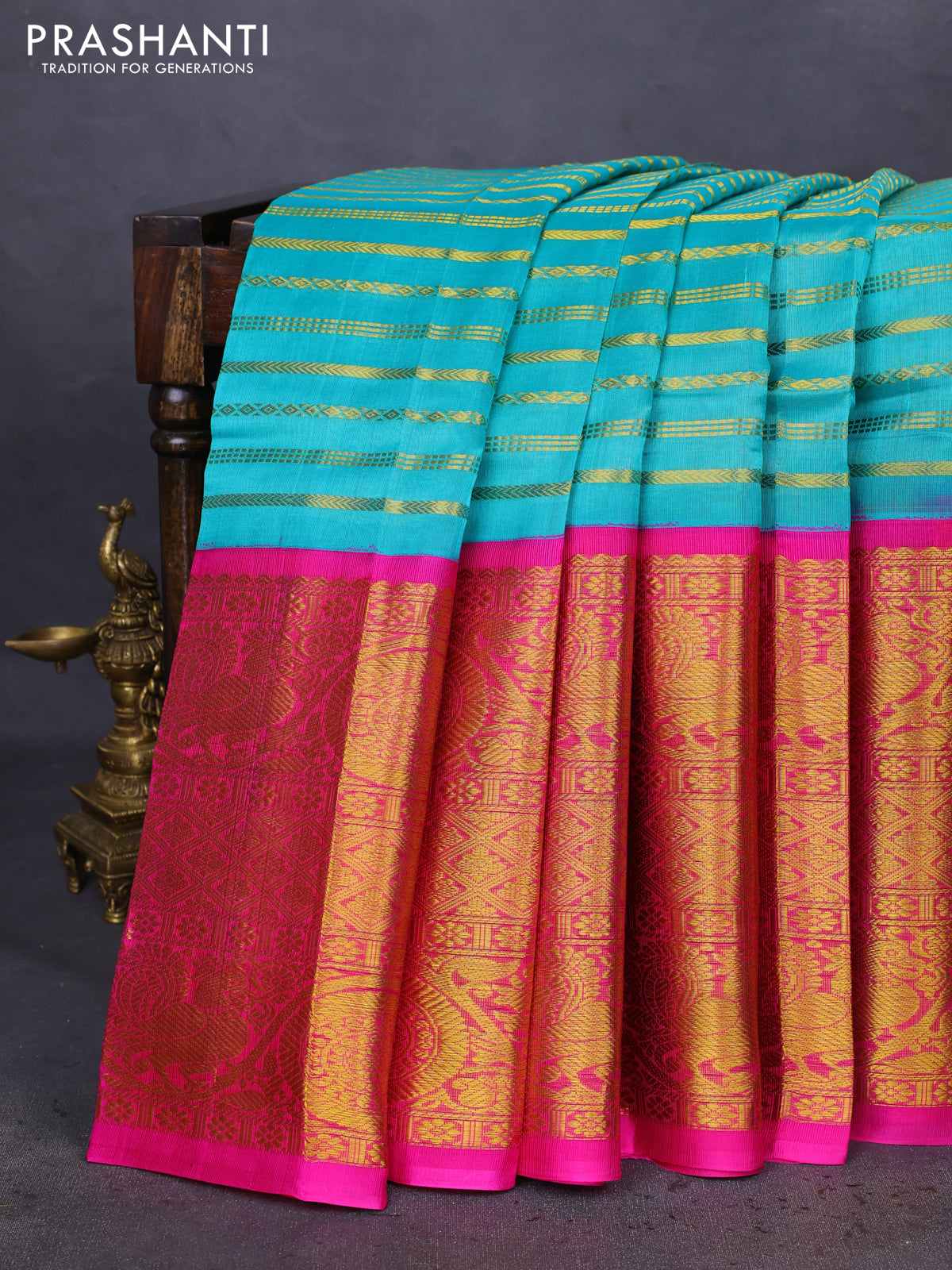 Kuppadam silk cotton saree teal blue and pink with allover zari stripes pattern and long zari woven border