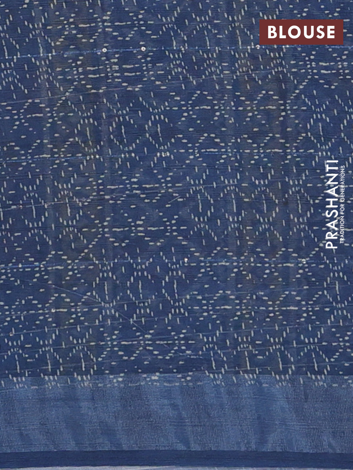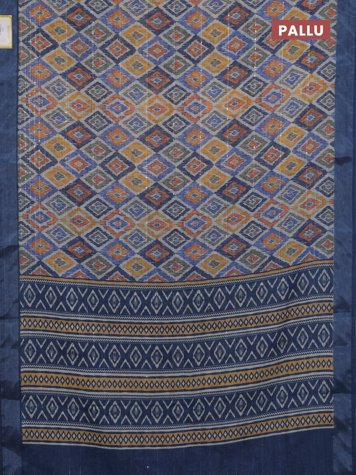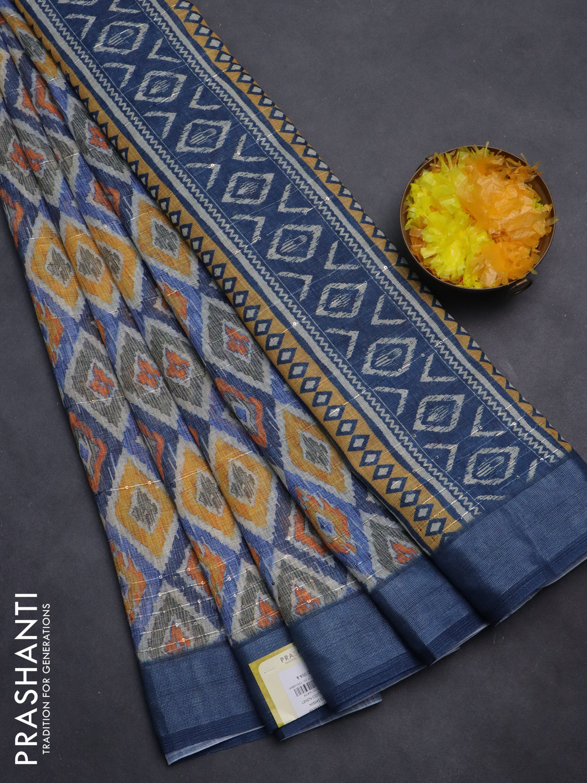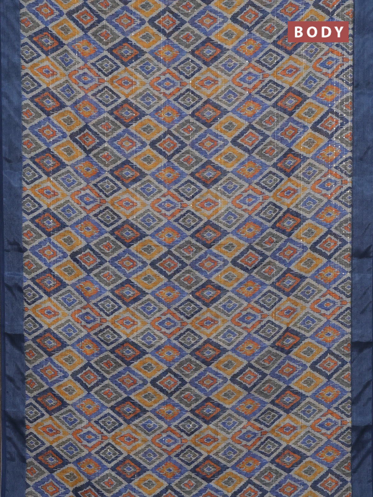 Linen cotton saree beige and blue with geometric prints & sequin work and silver zari woven border