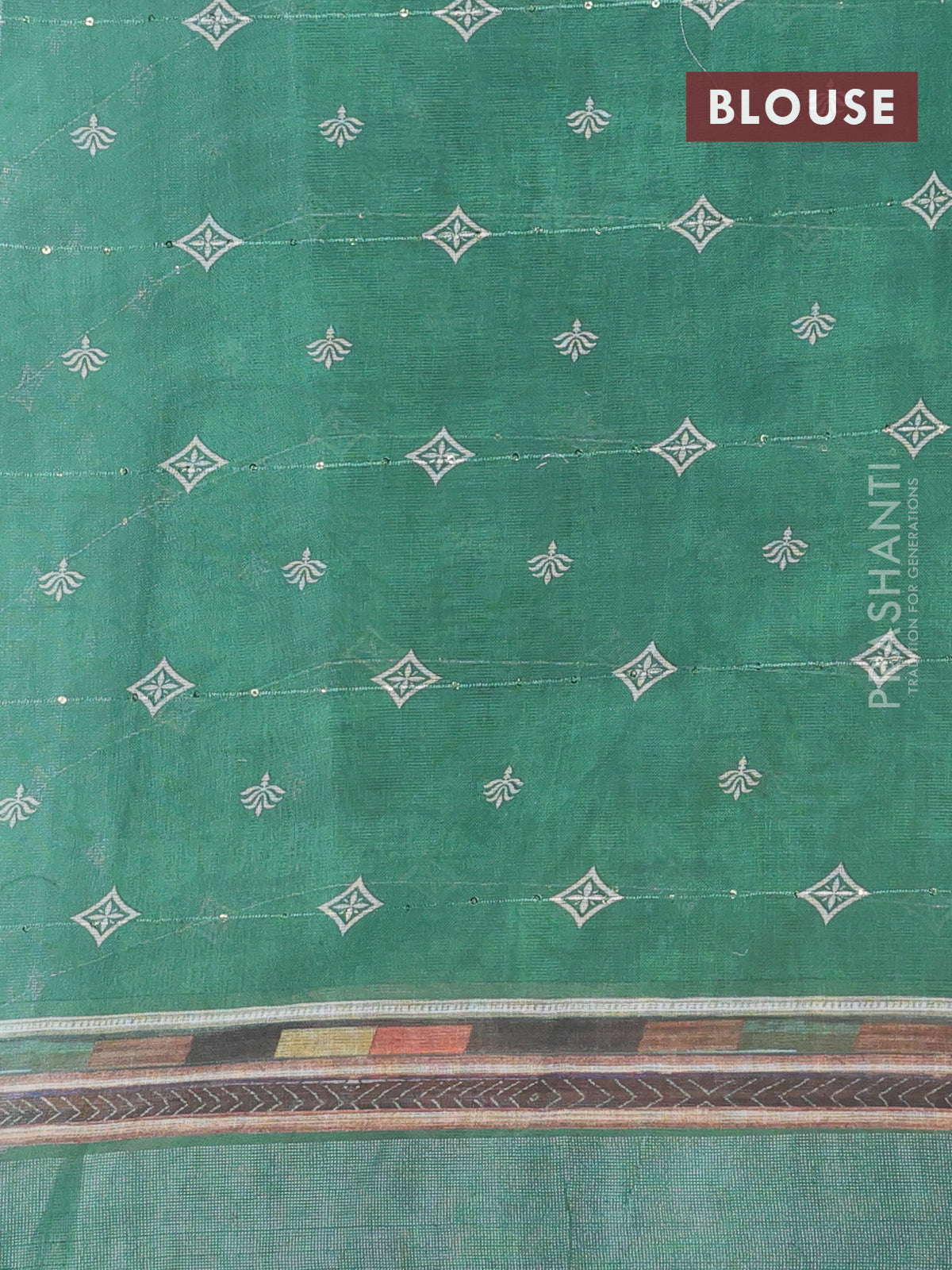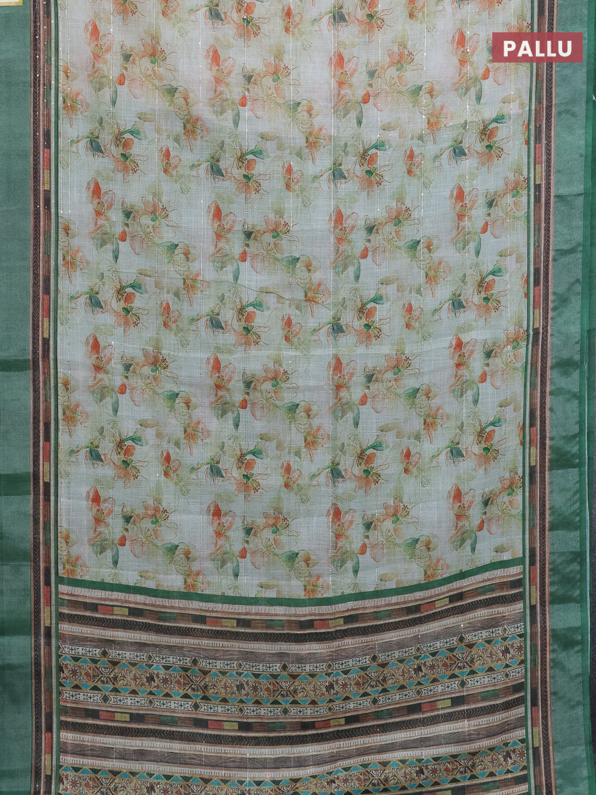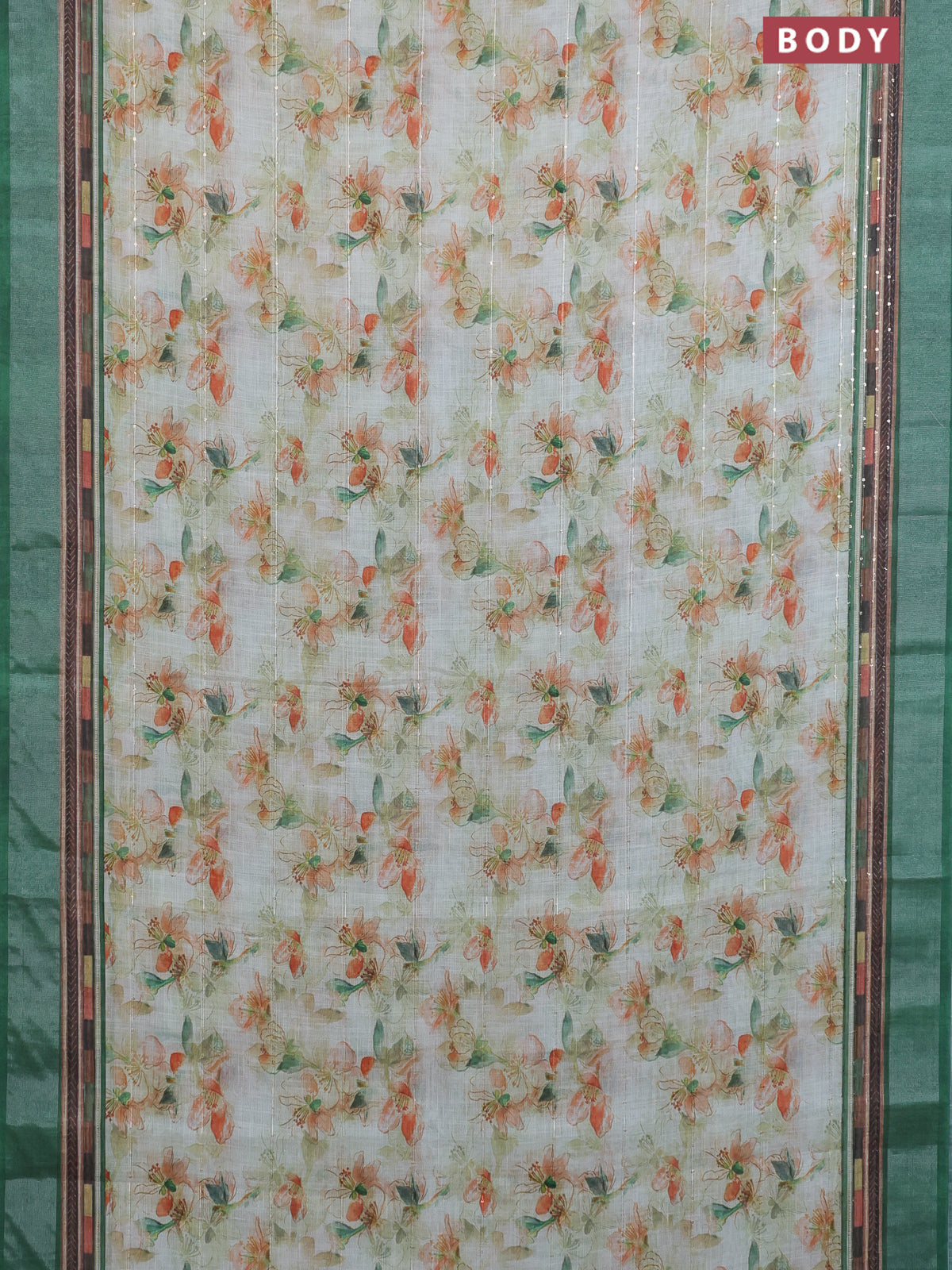 Linen cotton saree cream and green with allover floral prints & sequin work and silver zari woven border