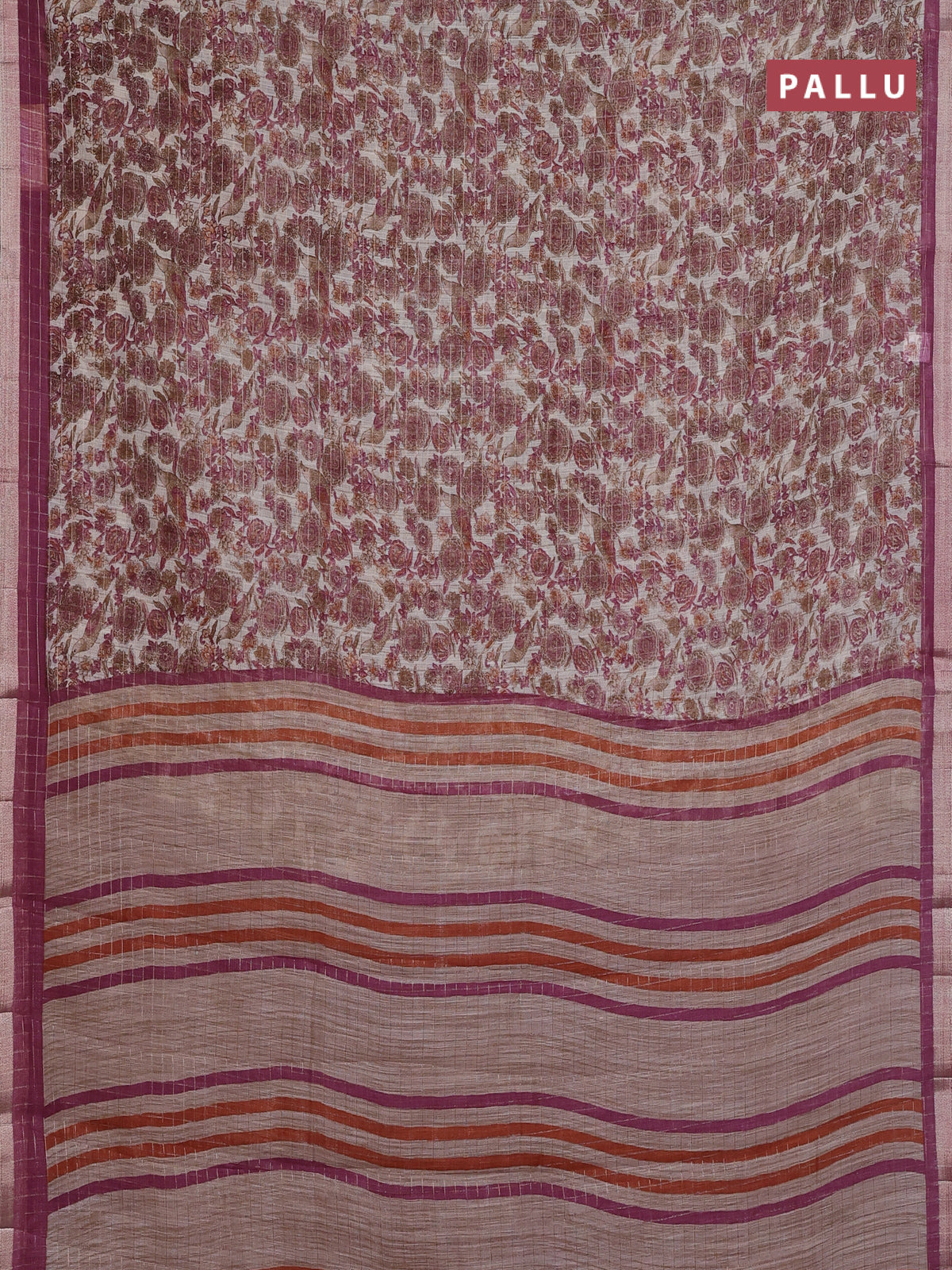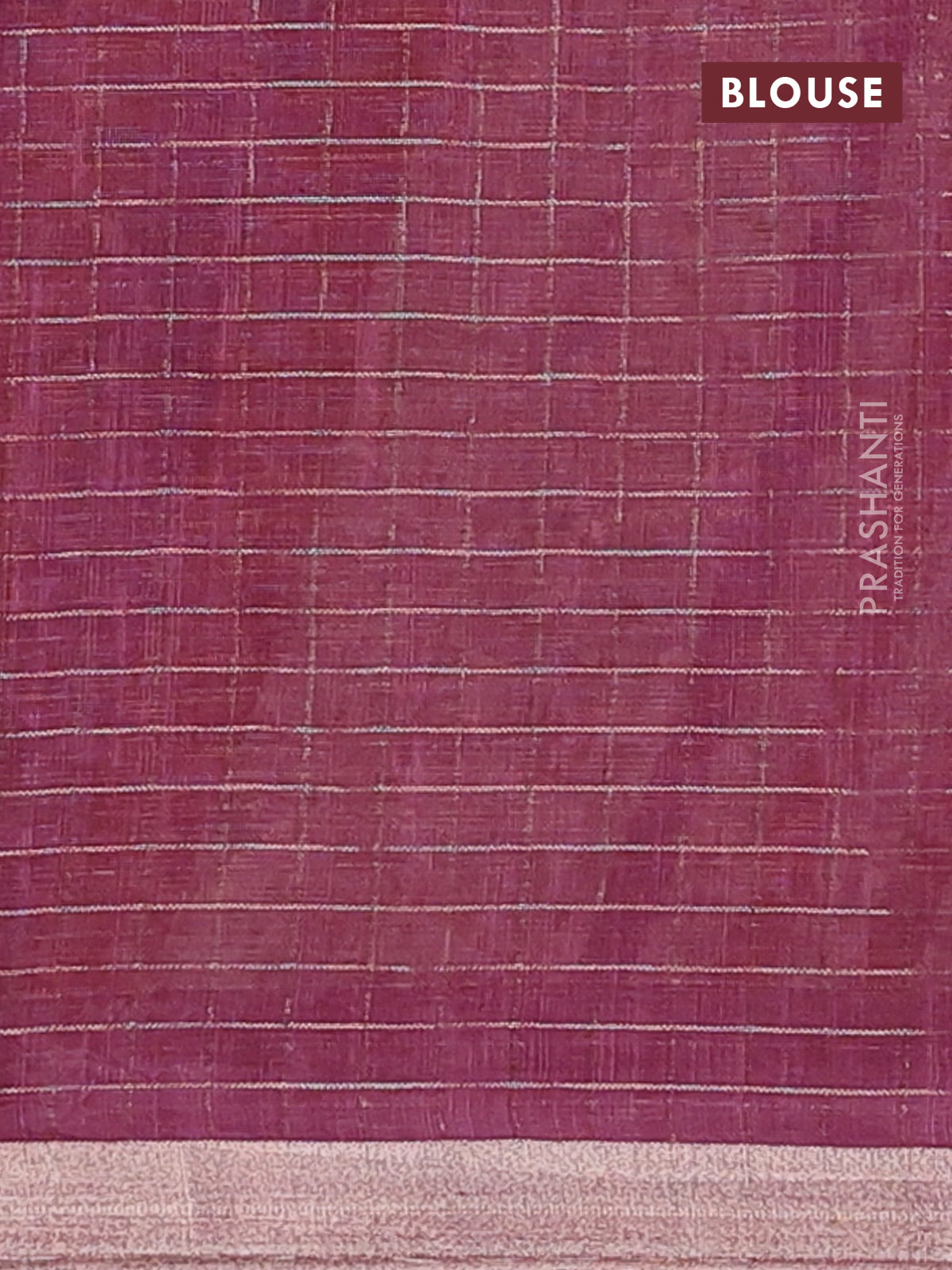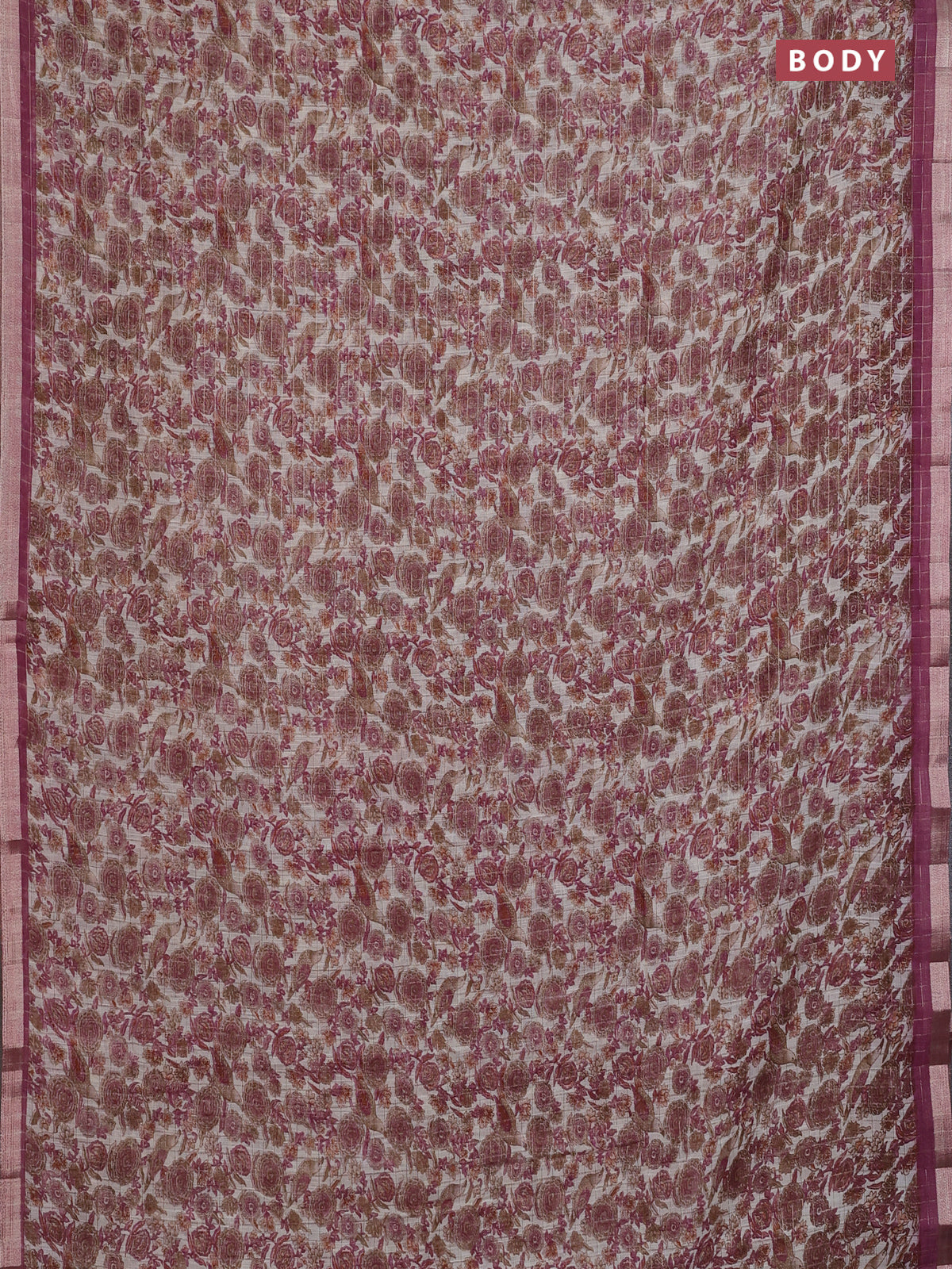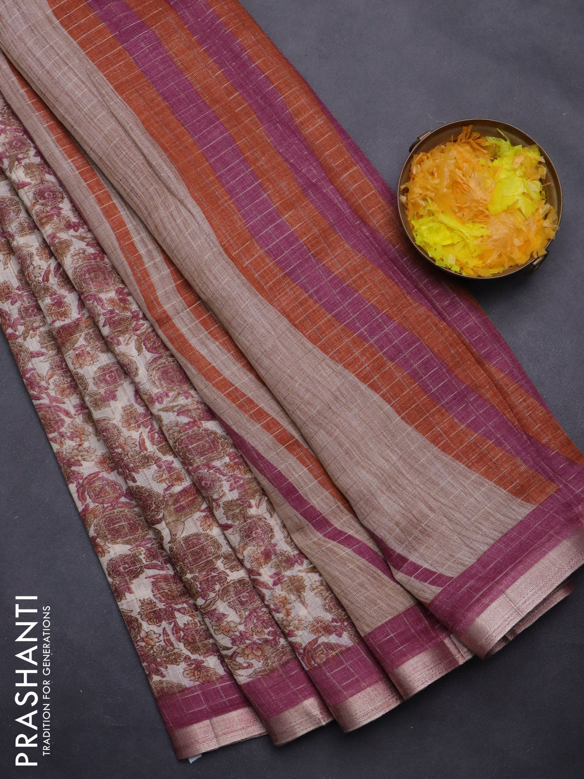 Linen cotton saree cream and wine shade with allover prints & zari checks and zari woven border