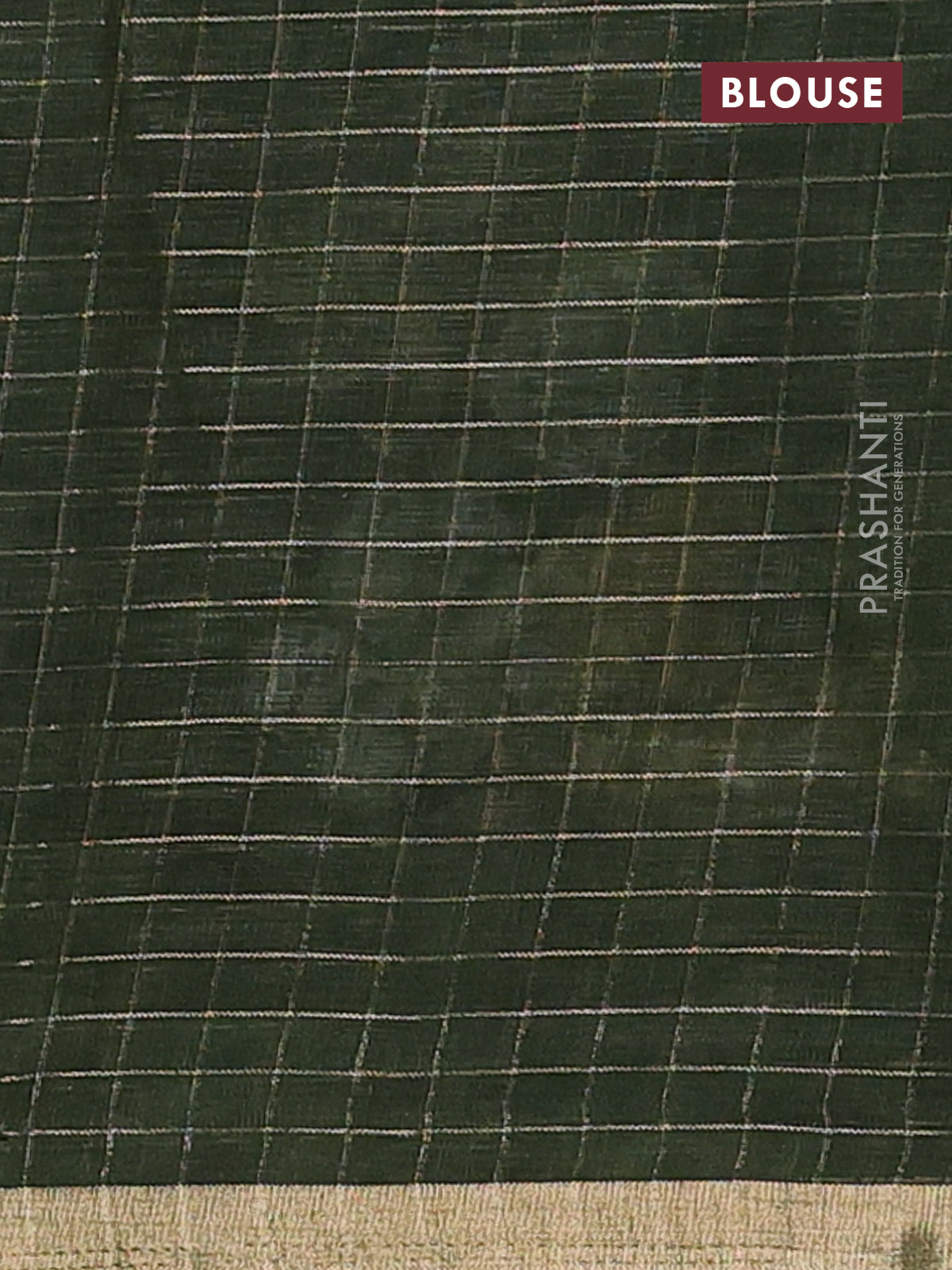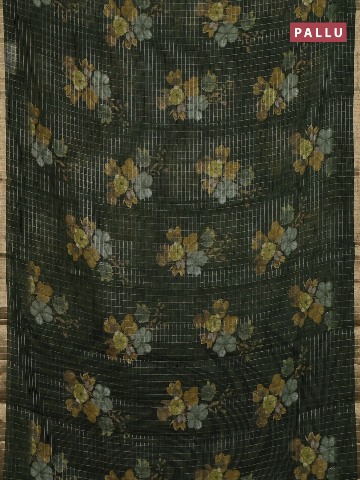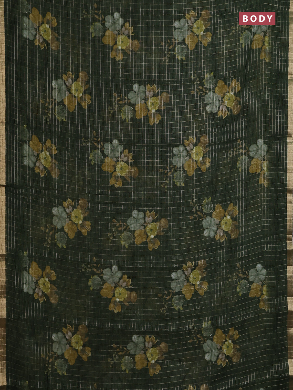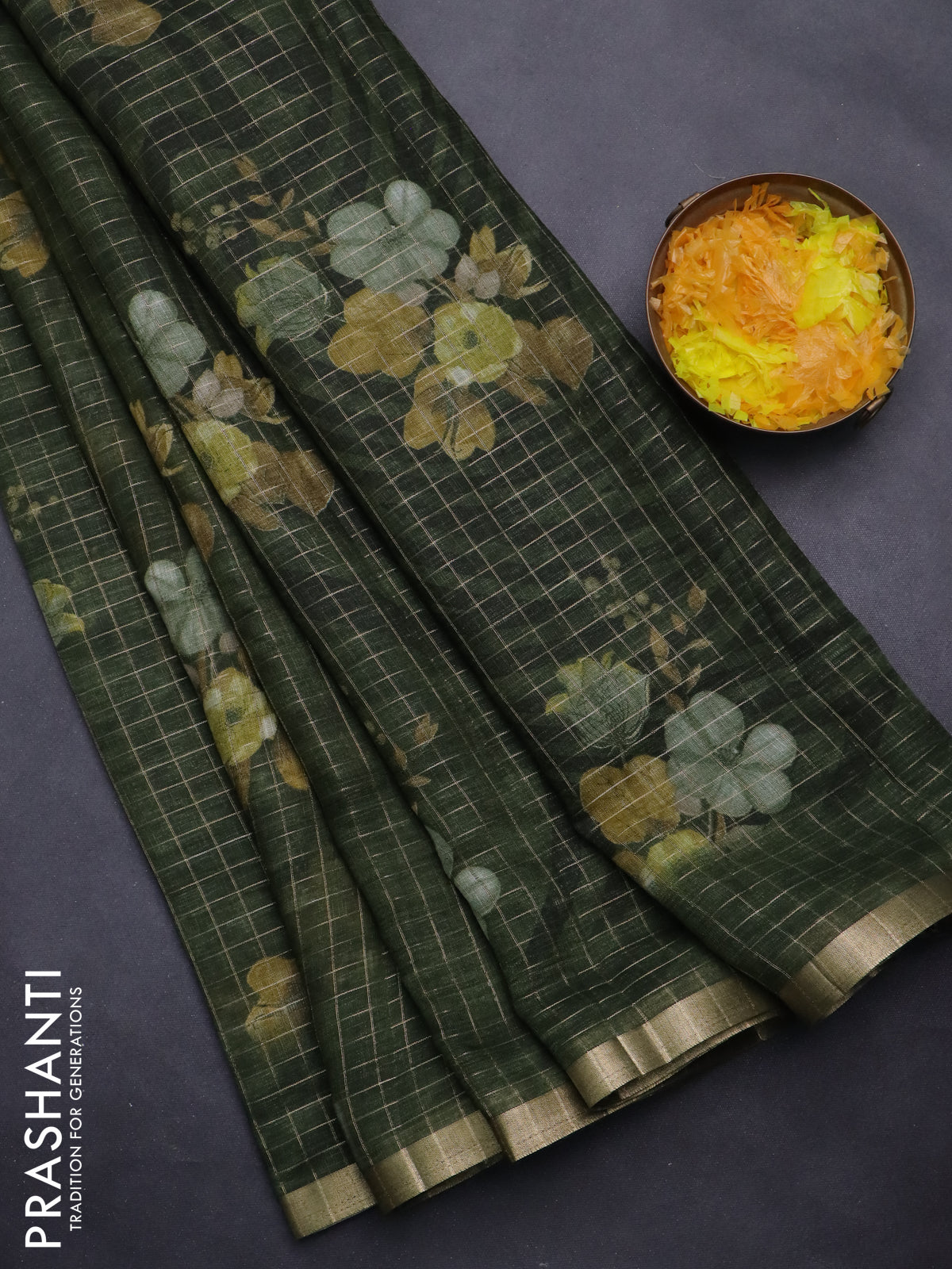 Linen cotton saree dark sap green with allover floral prints & zari checks and zari woven border