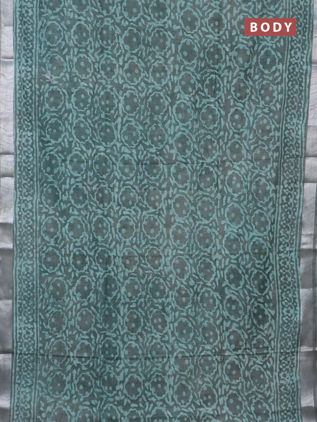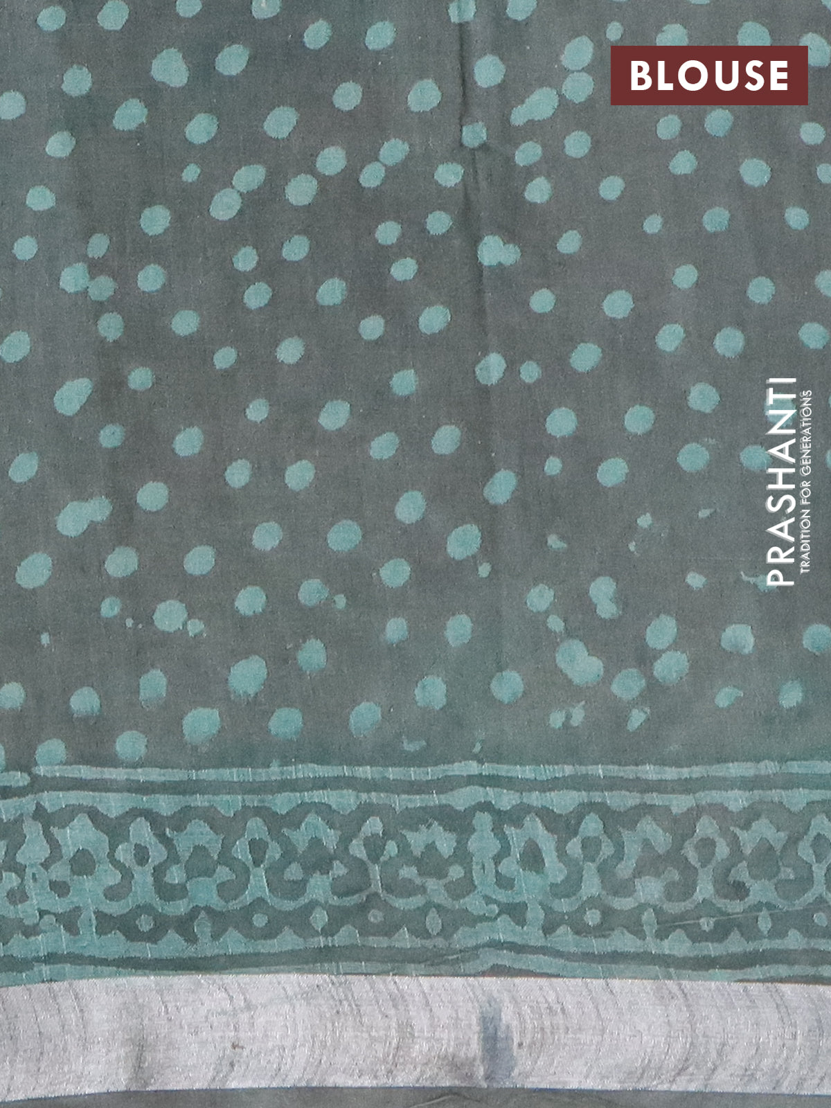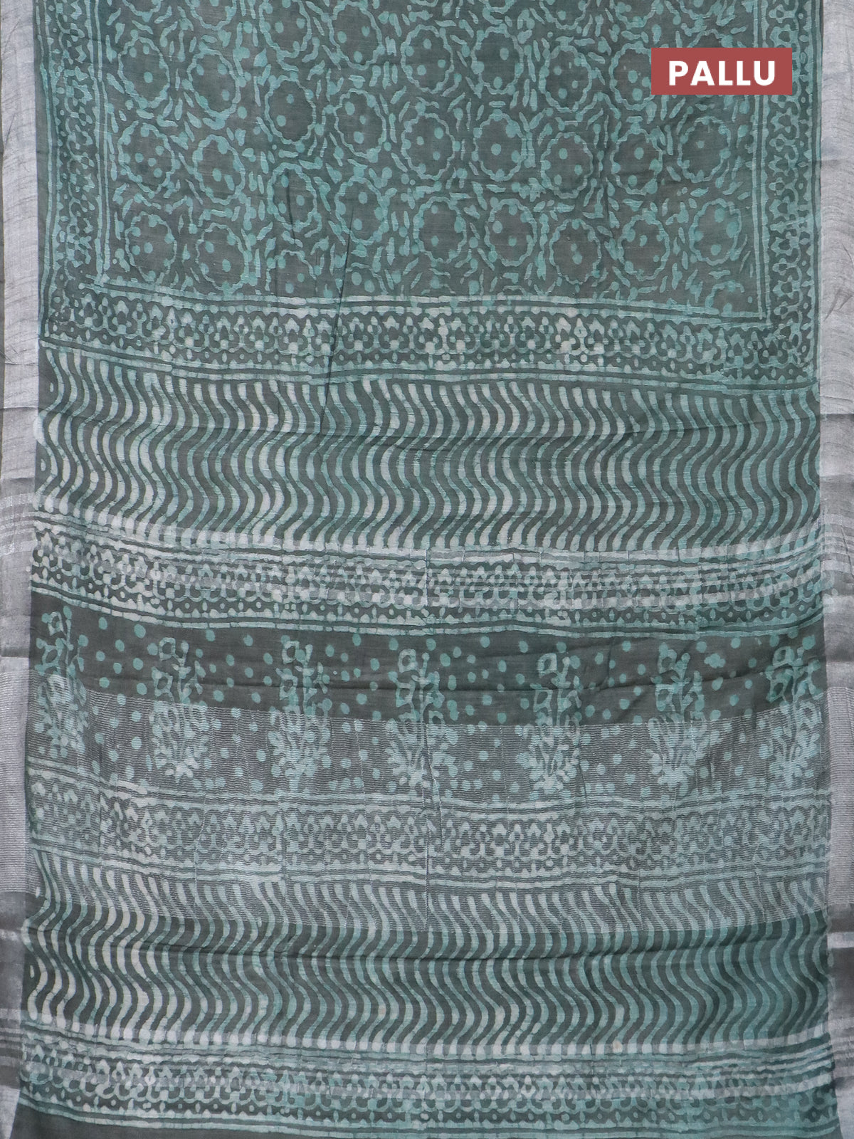 Linen cotton saree greyish green with allover batik prints and silver zari woven border