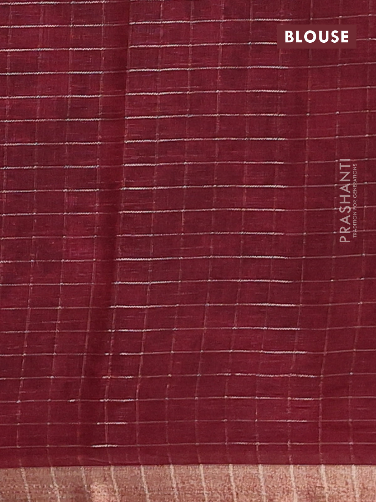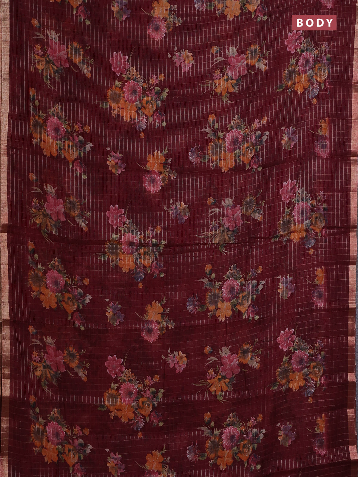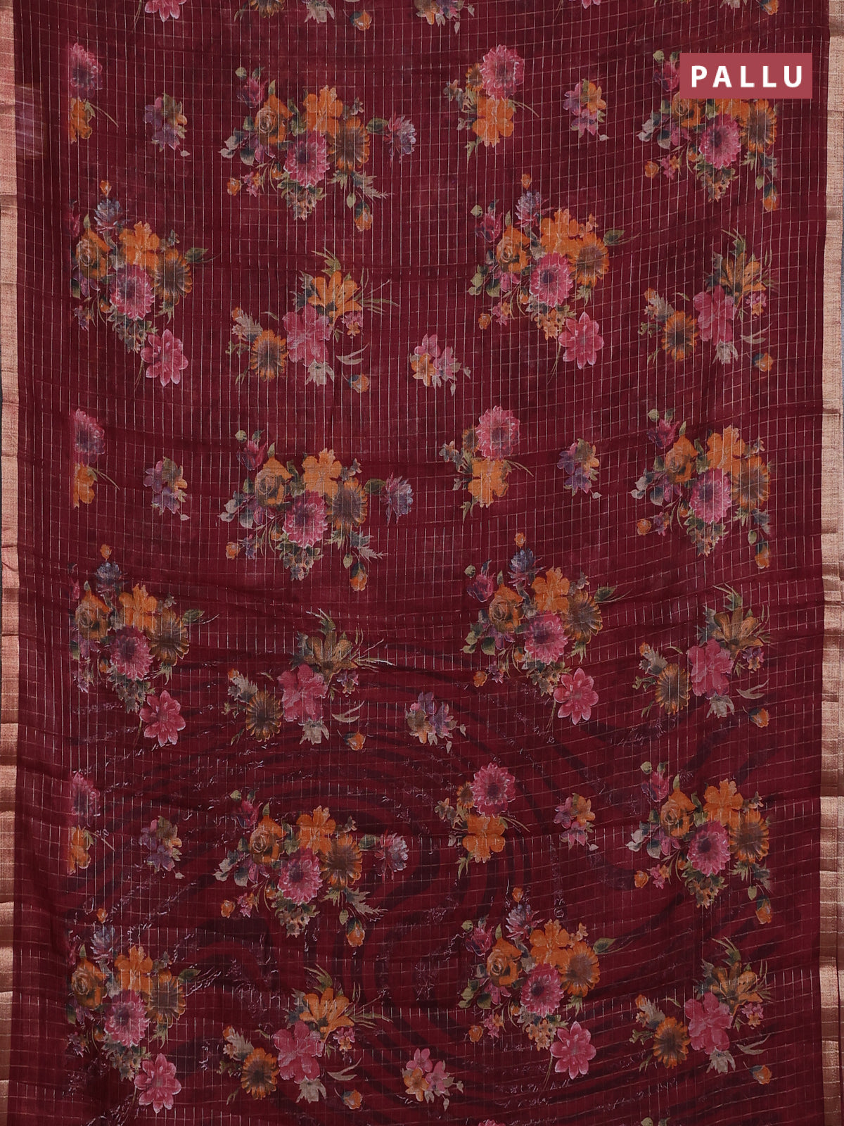 Linen cotton saree maroon with allover floral prints & zari checks and zari woven border