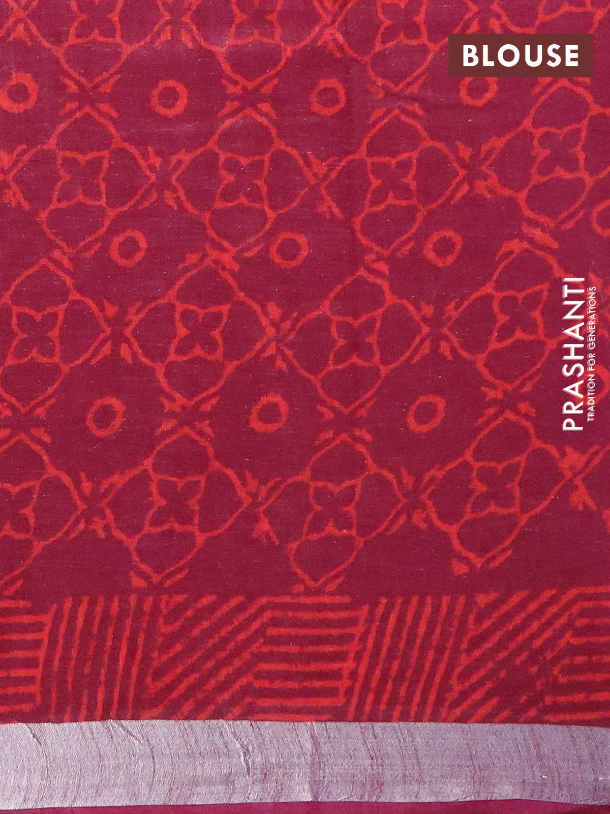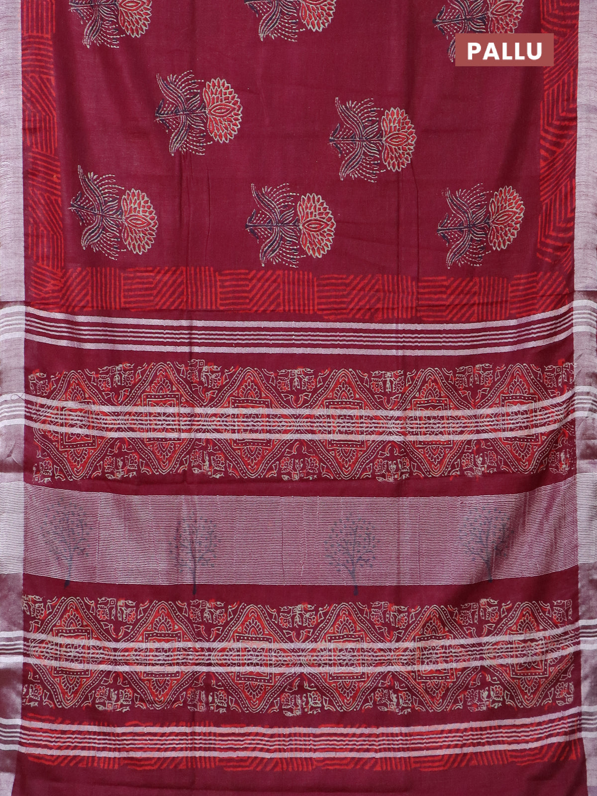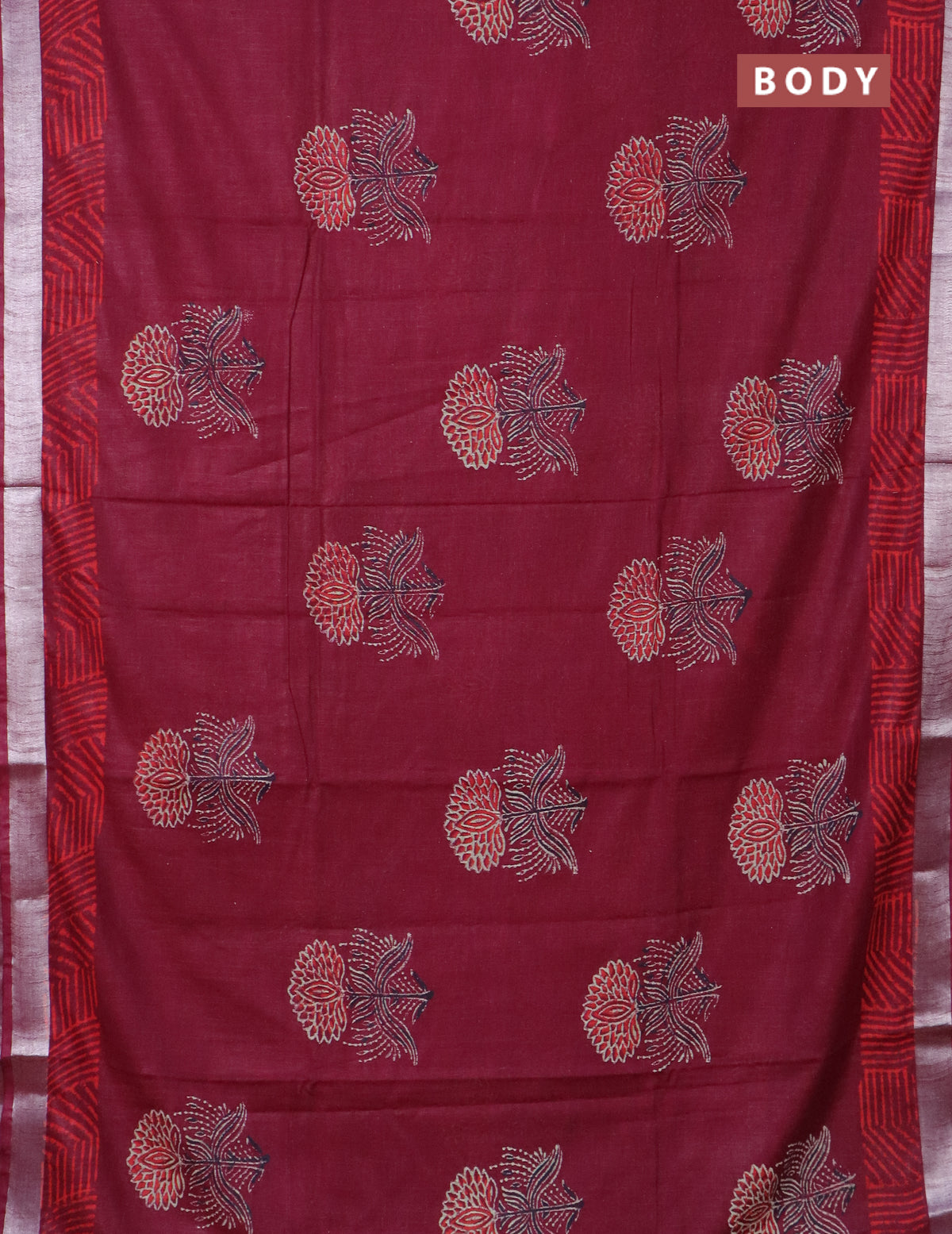 Linen cotton saree maroon with floral butta prints and silver zari woven border