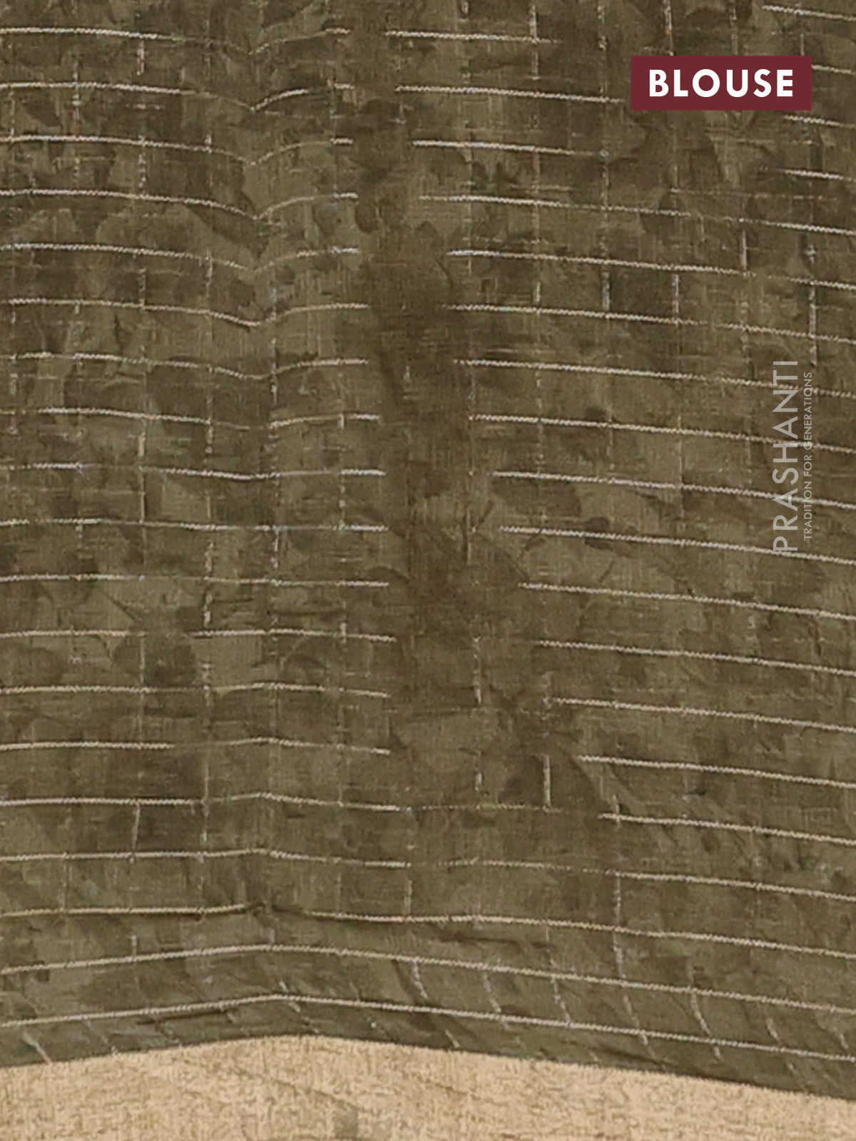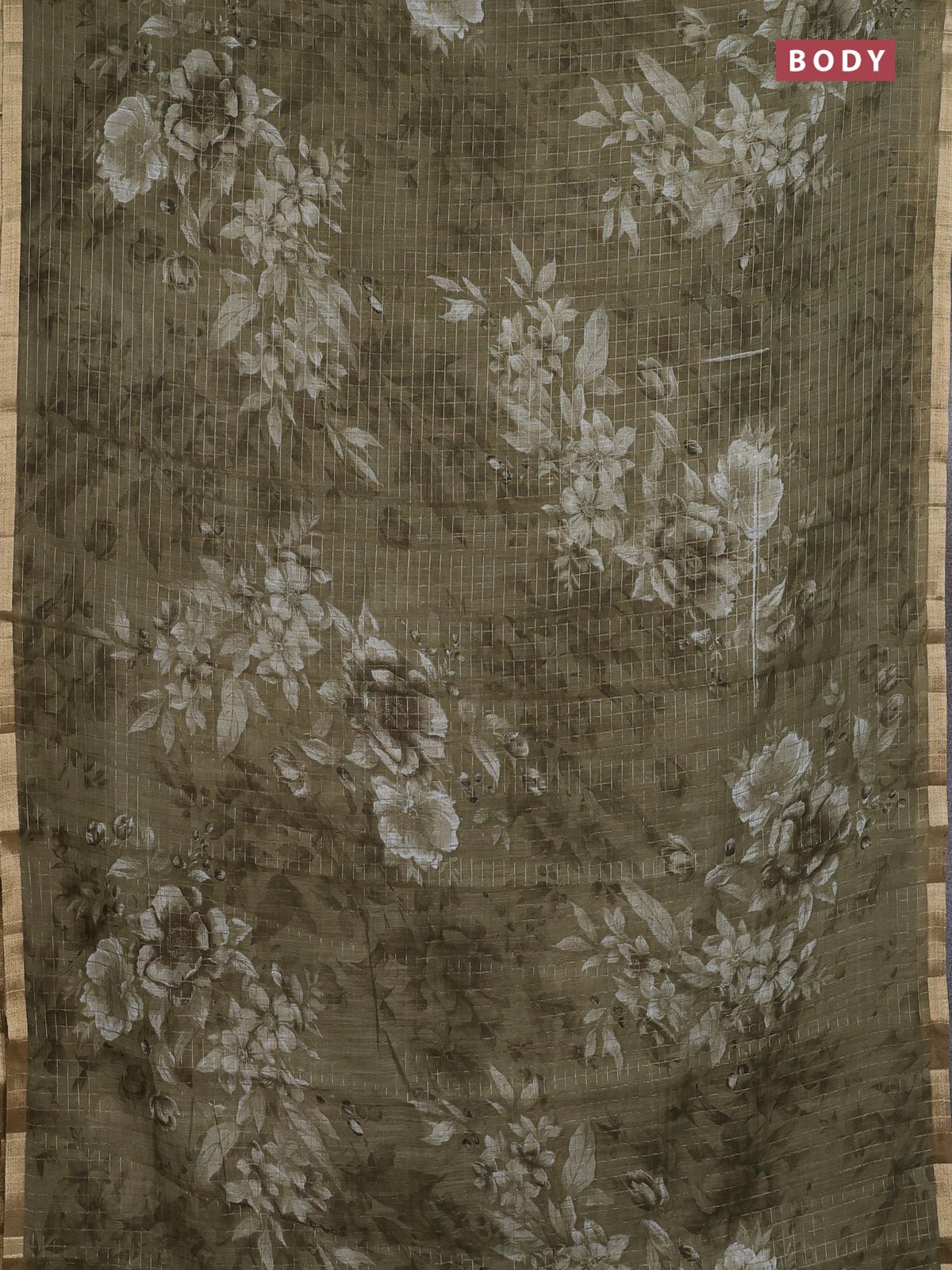 Linen cotton saree military green with allover floral prints & zari checks and zari woven border