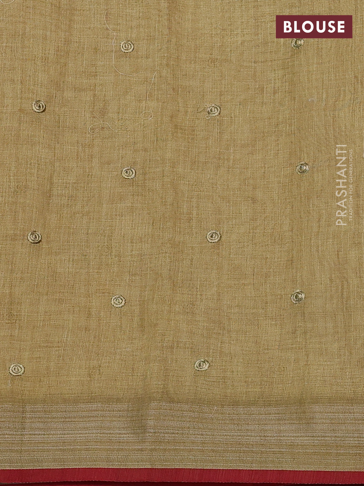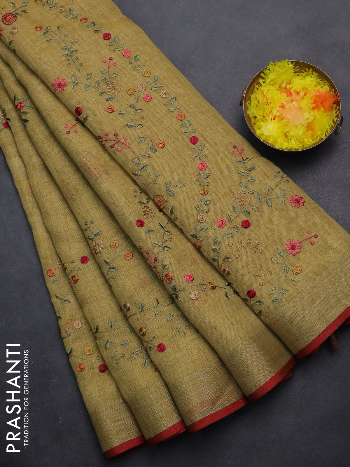 linen cotton saree mustard yellow and red with embroidery buttas and zari woven border
