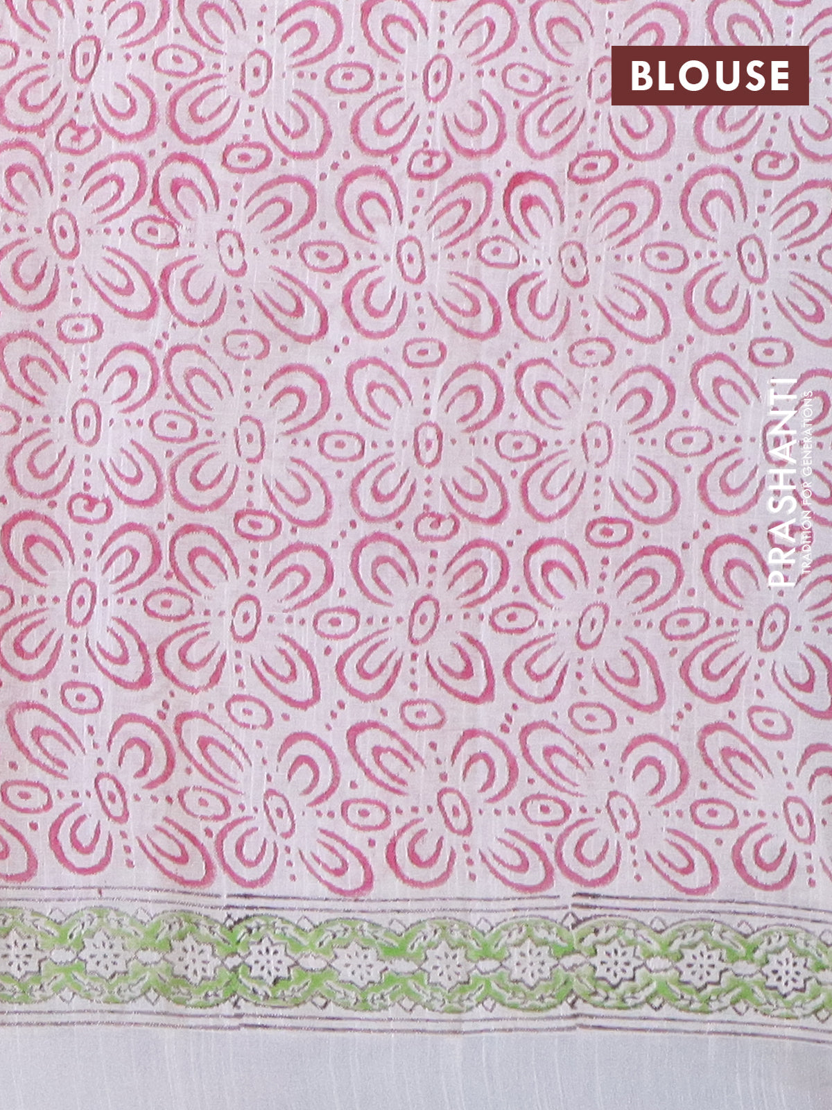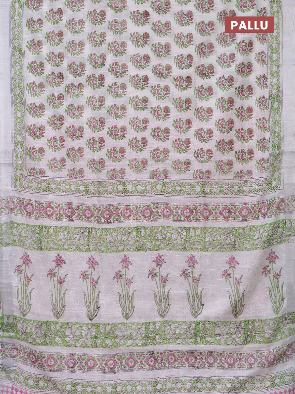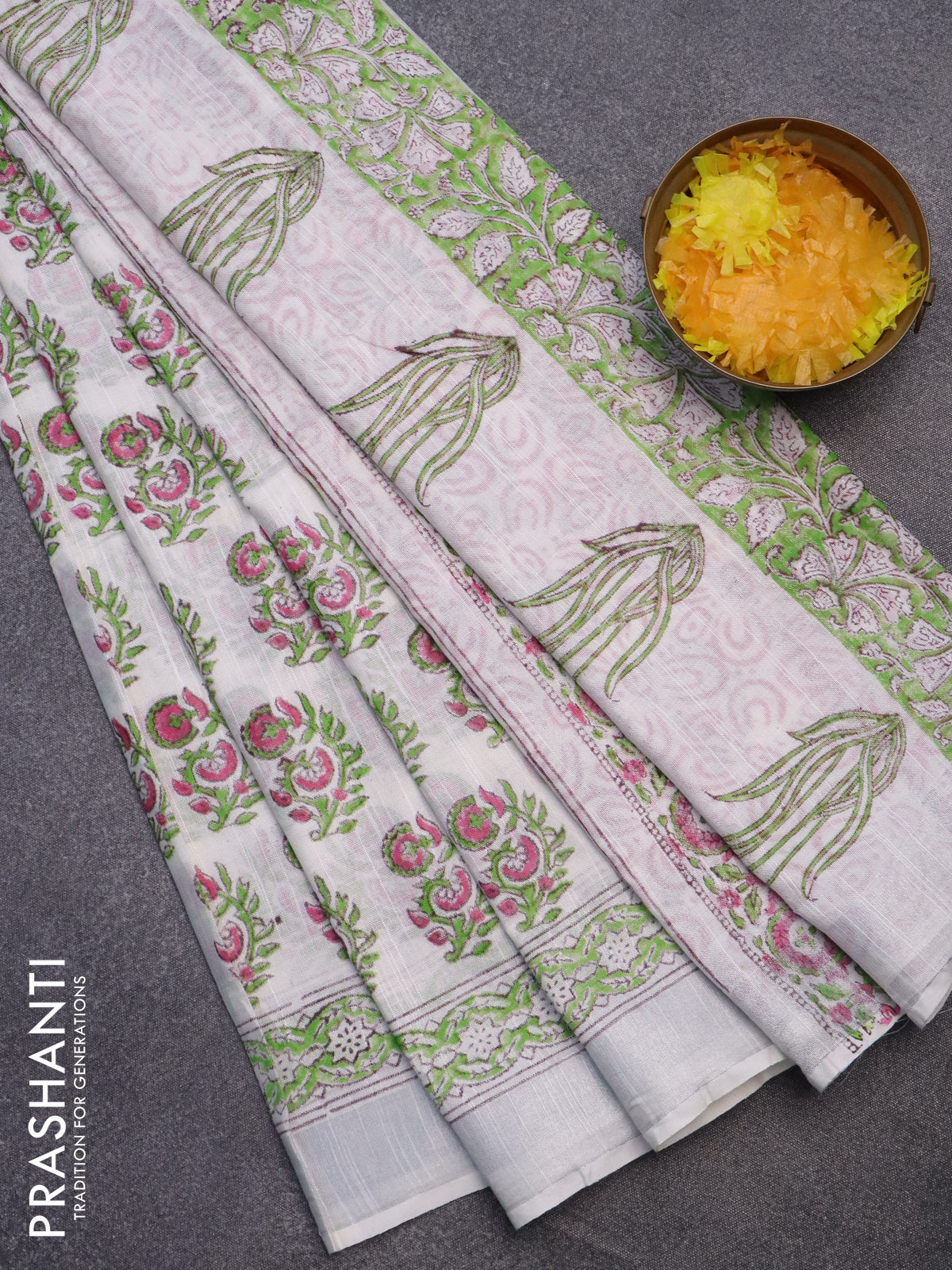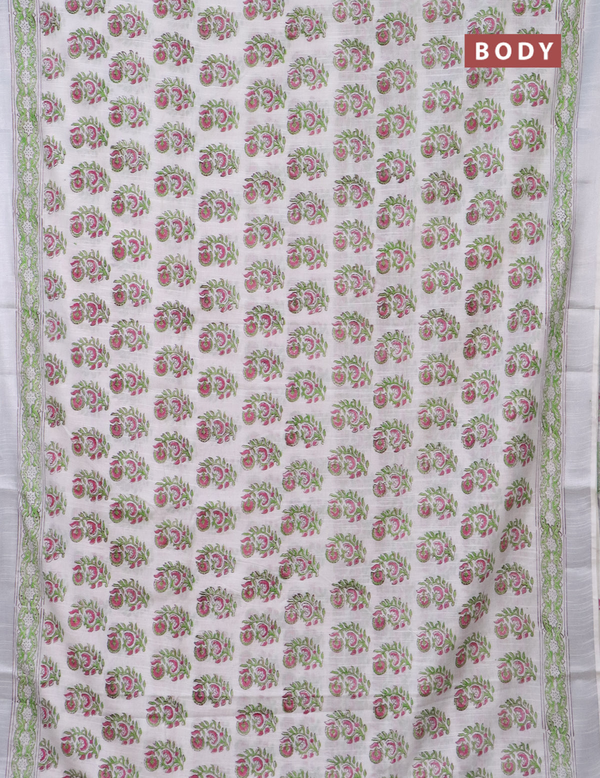 Linen cotton saree off white and green with allover butta prints and silver zari woven border