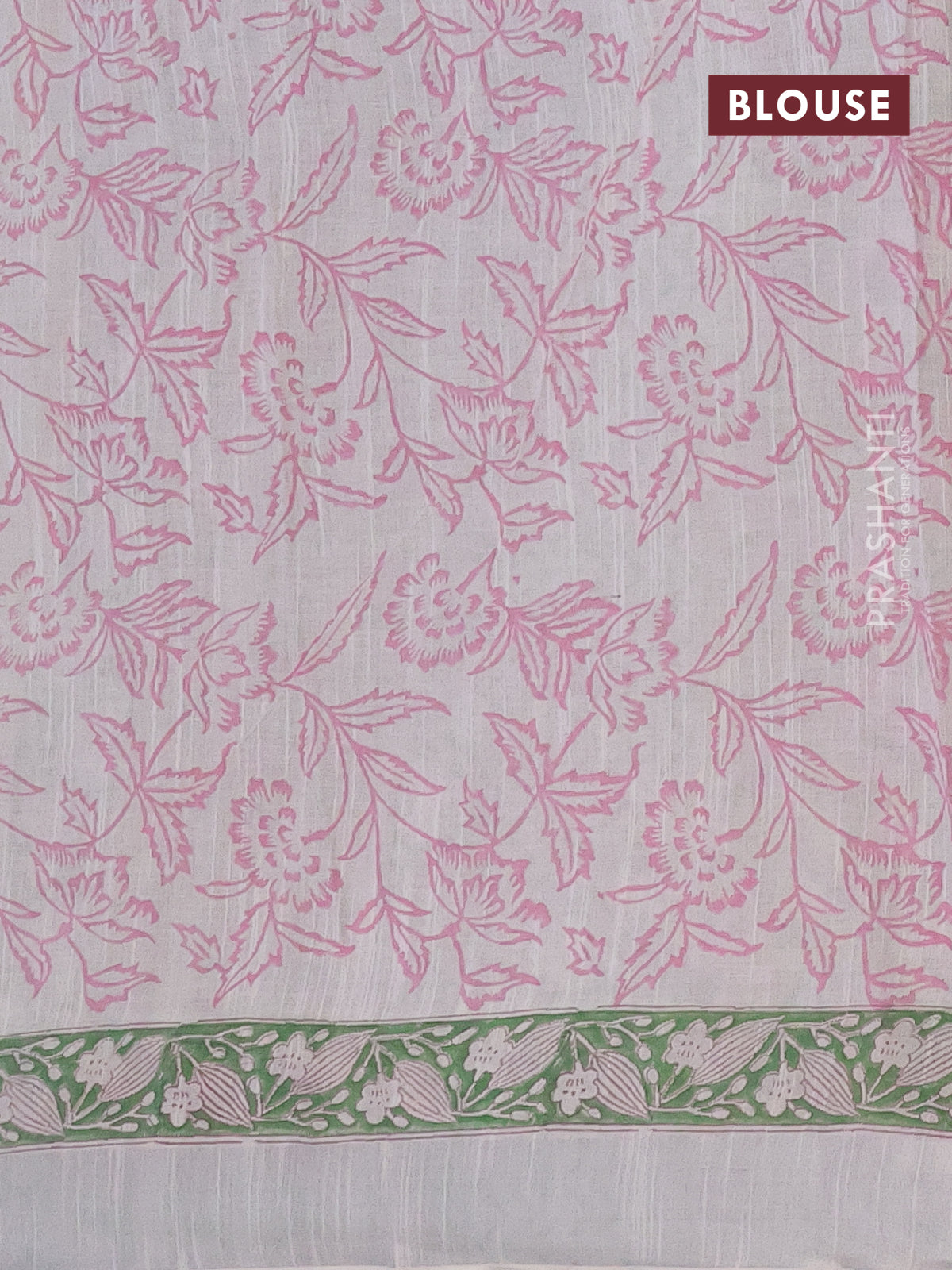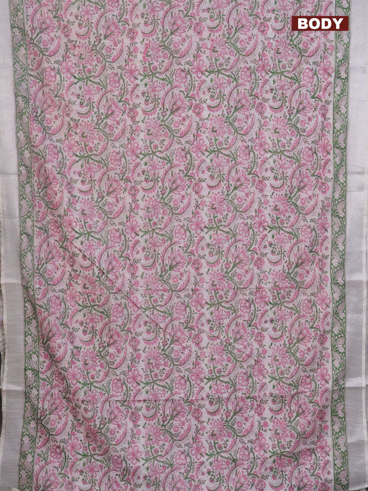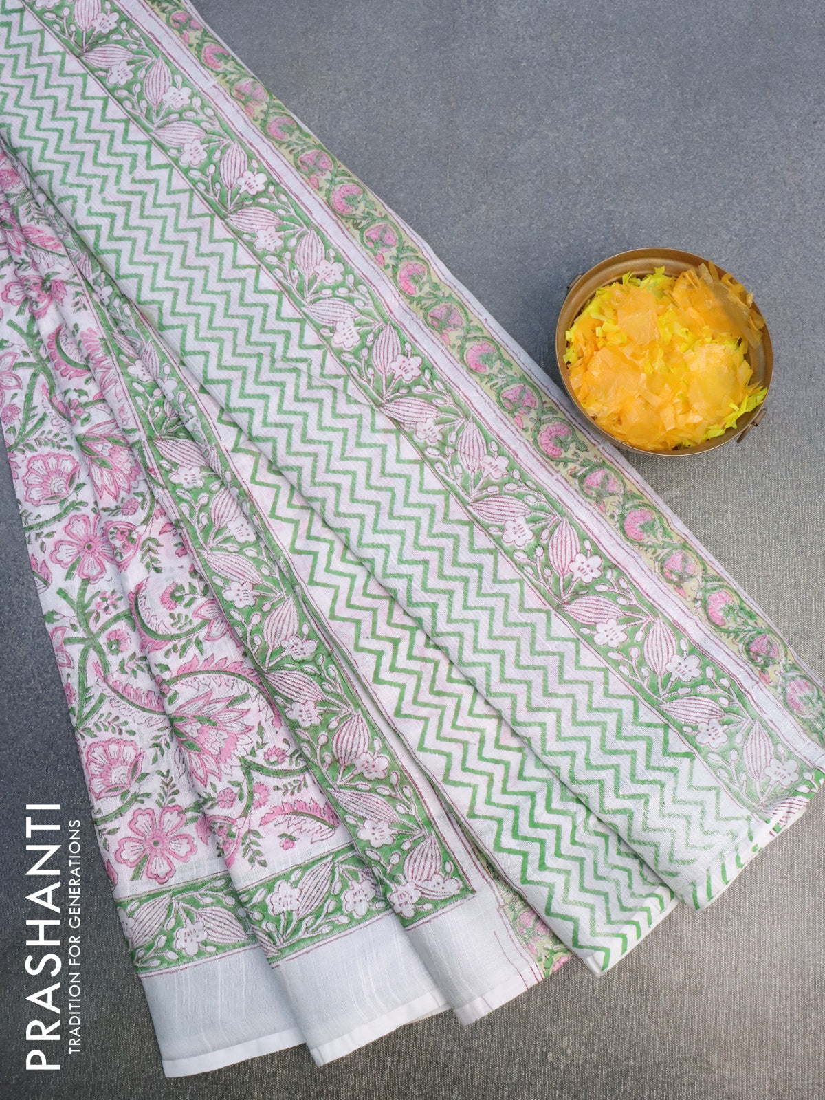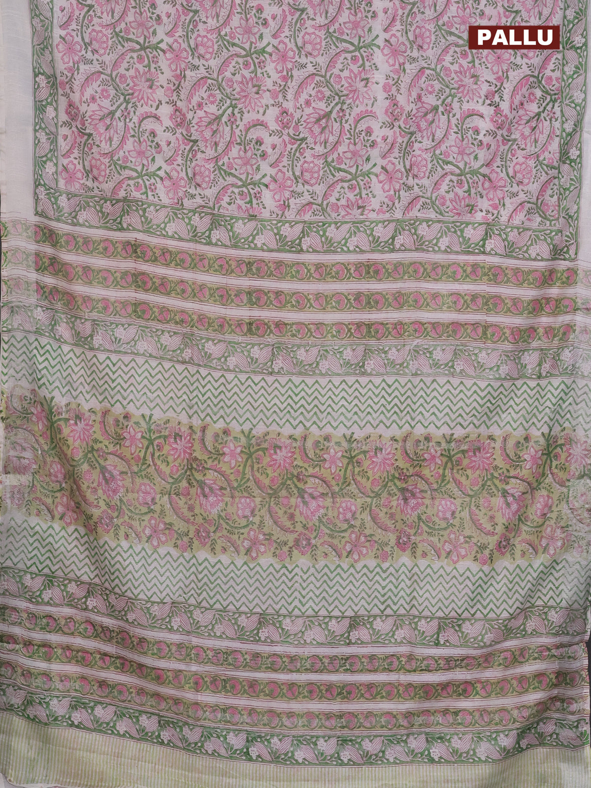 Linen cotton saree off white and pink green with allover kalamkari prints and silver zari woven border