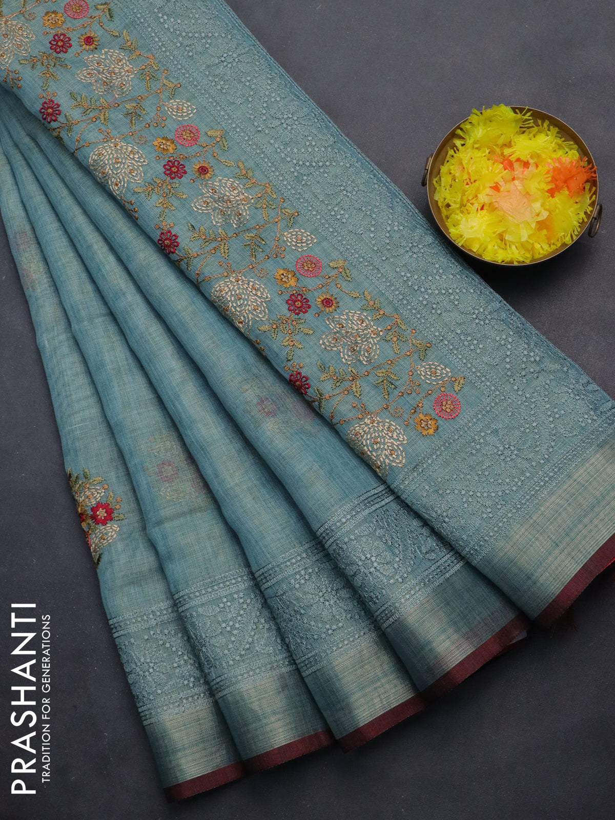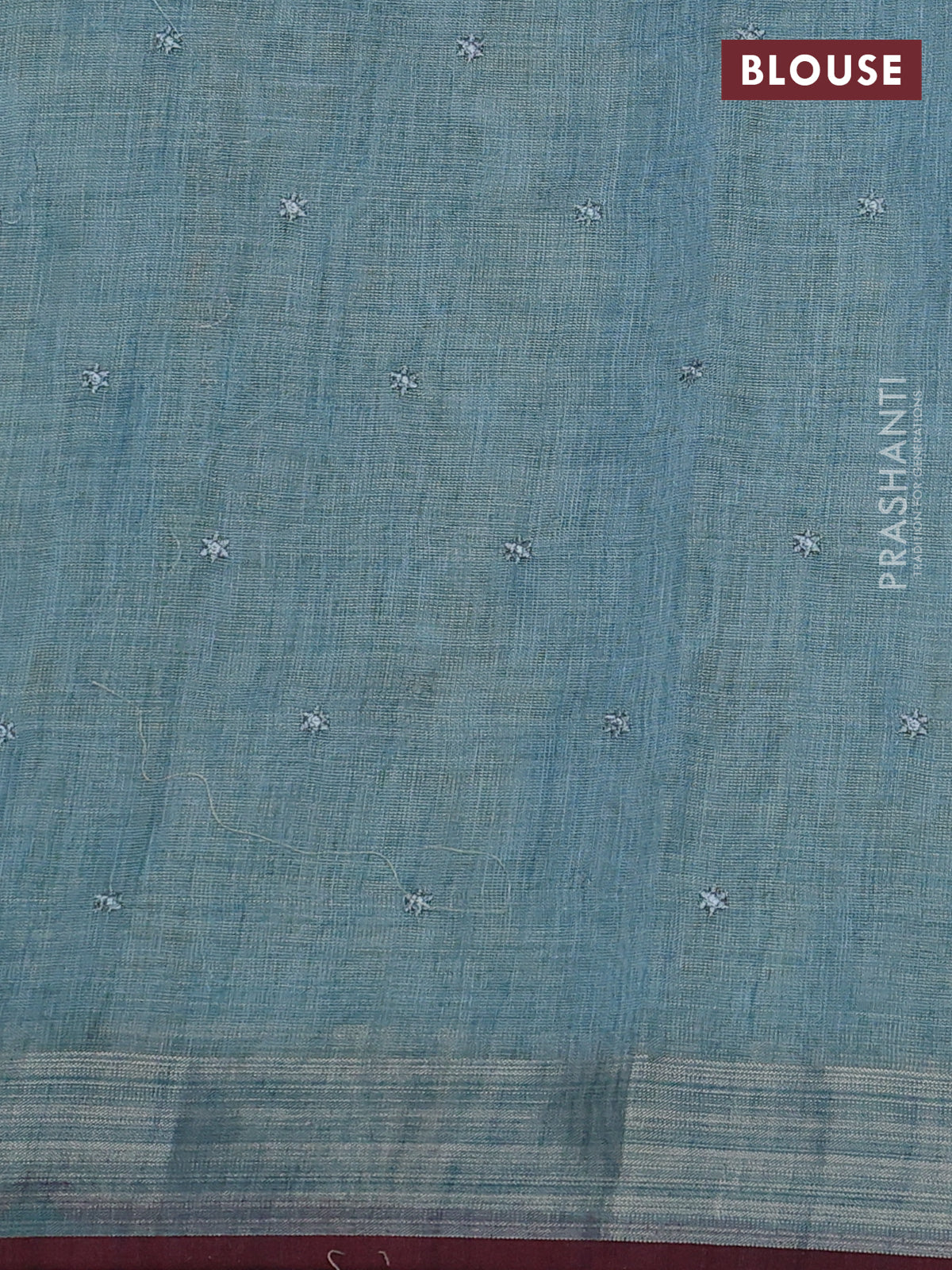 linen cotton saree pastel blue and maroon with embroidery buttas and zari woven border