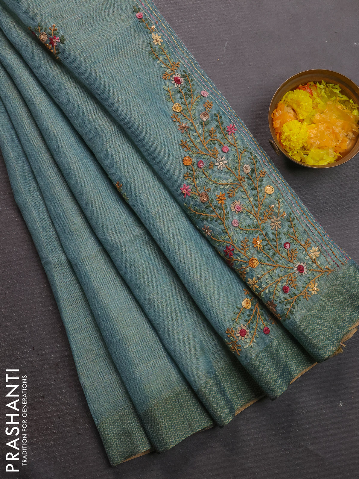 Linen cotton saree pastel blue with kantha stitch work and printed border