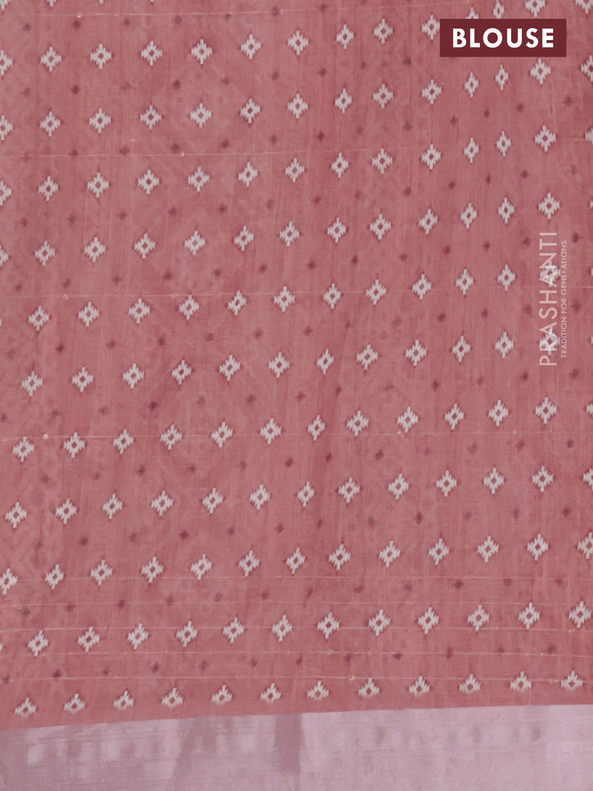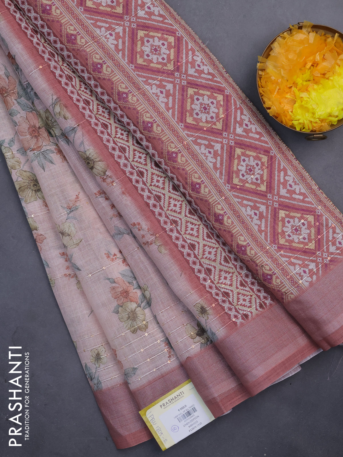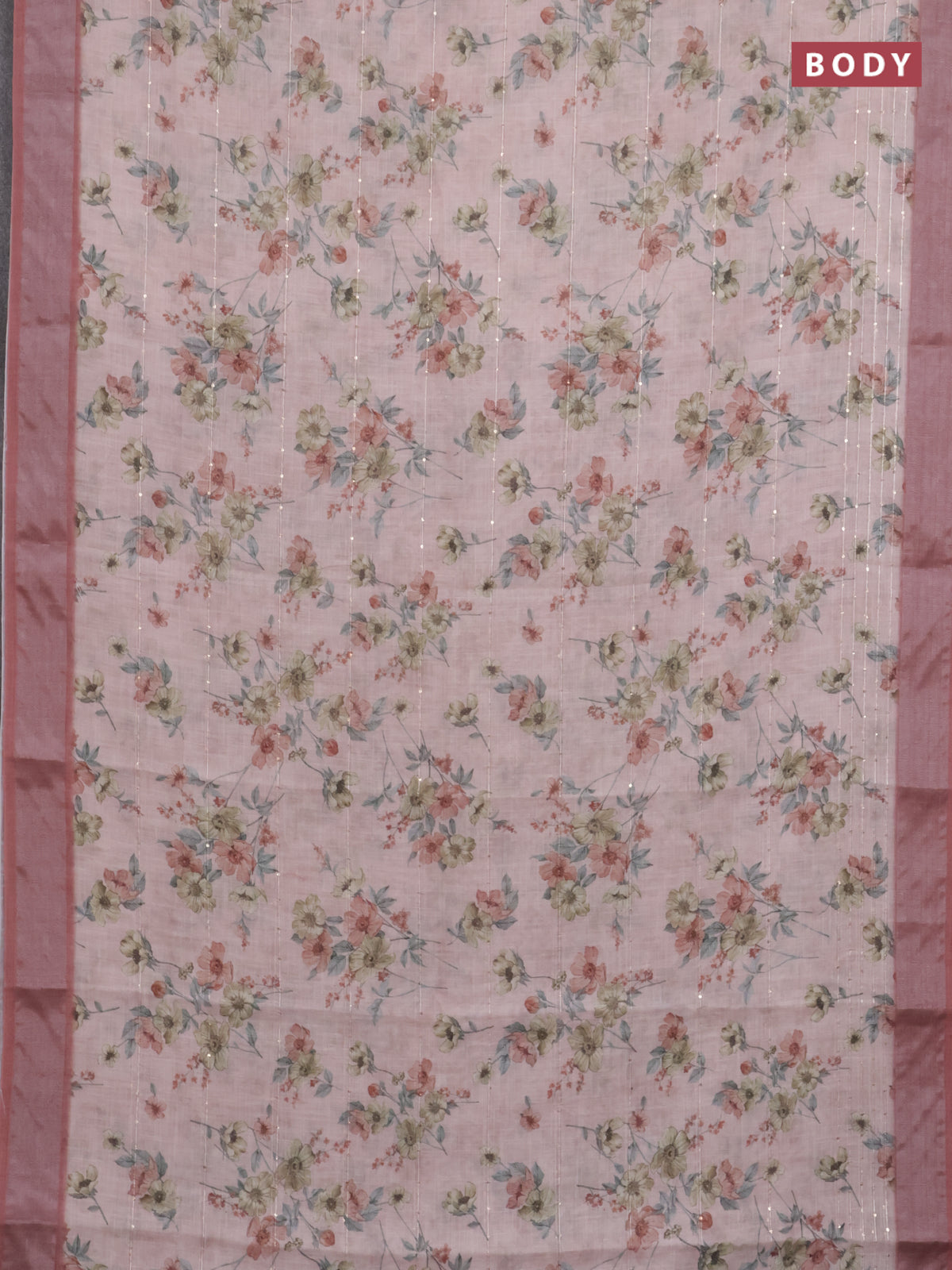 Linen cotton saree peach pink and rust shade with floral prints & sequin work and silver zari woven border