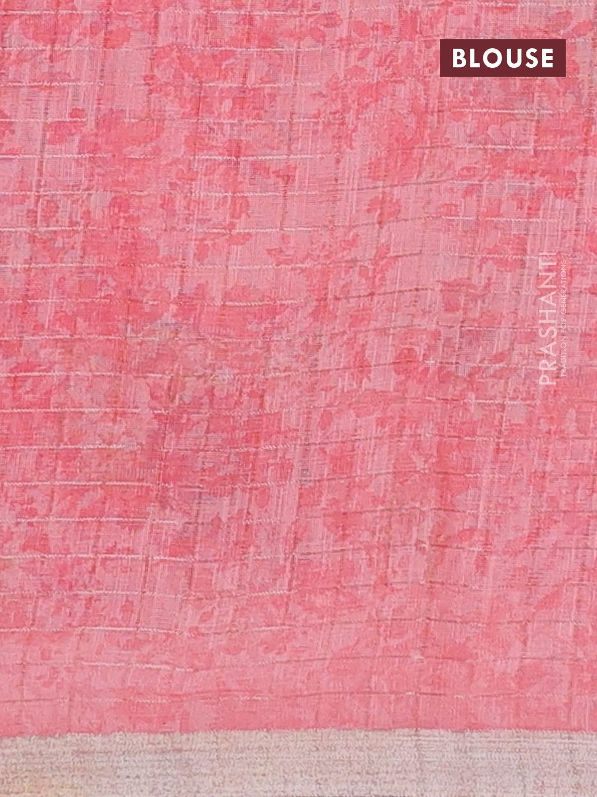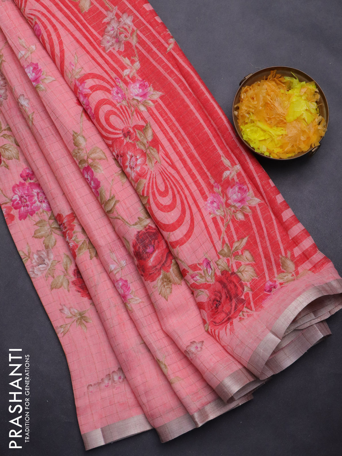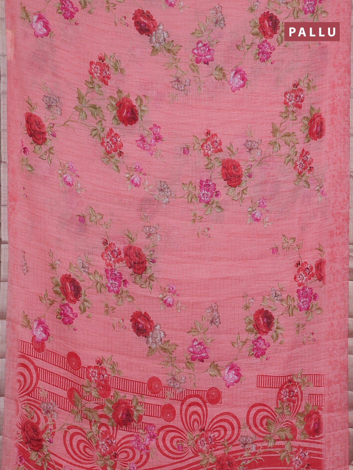 Linen cotton saree peach pink with allover floral prints & zari checks and zari woven border