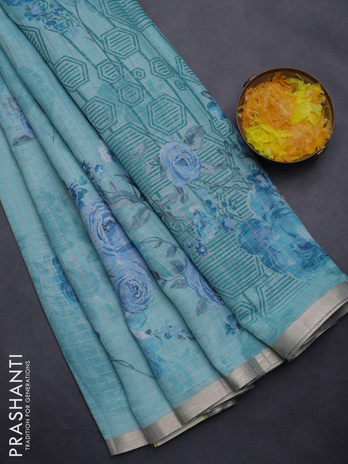Linen cotton saree teal blue with allover floral prints & zari checks and zari woven border