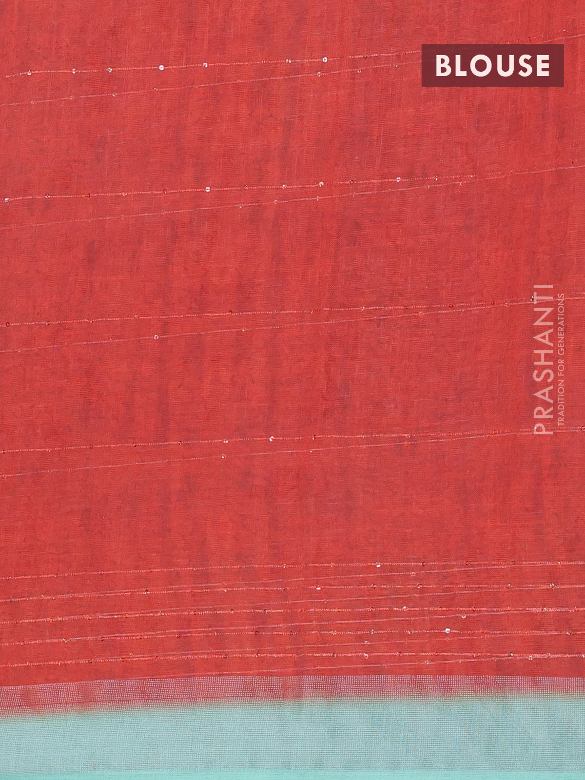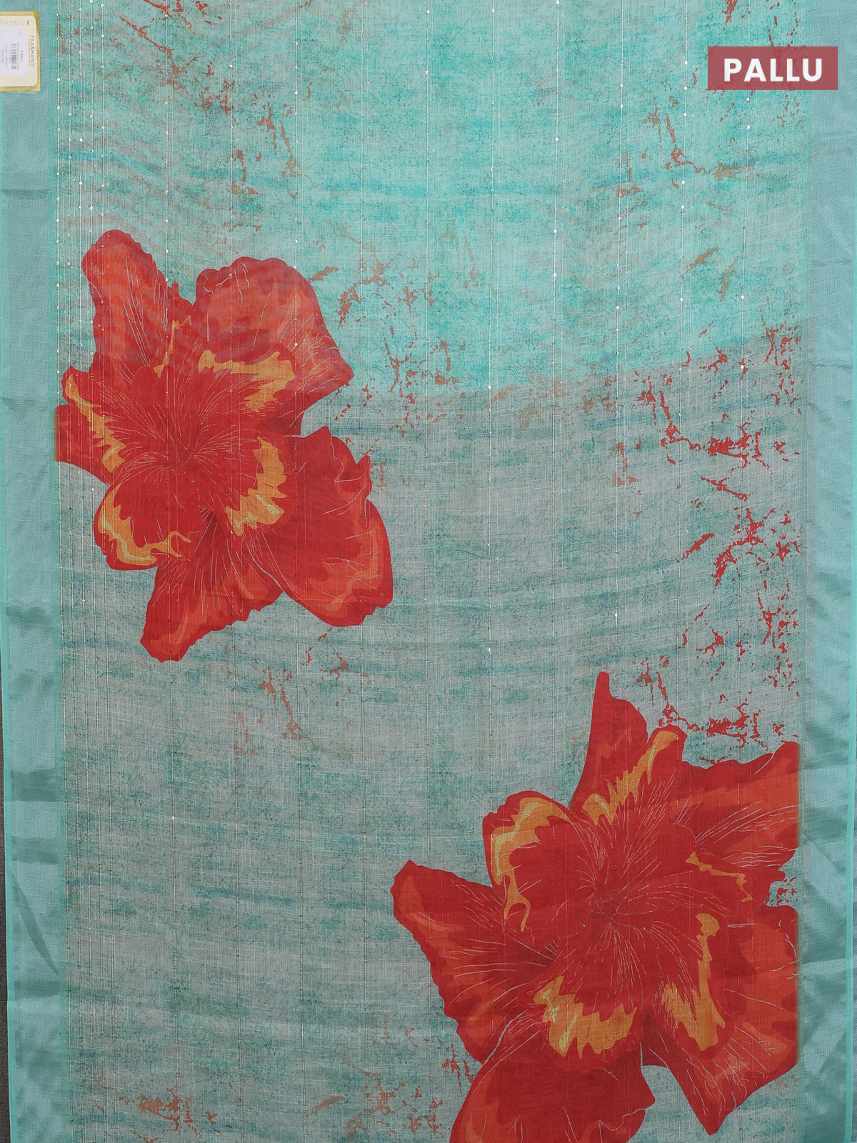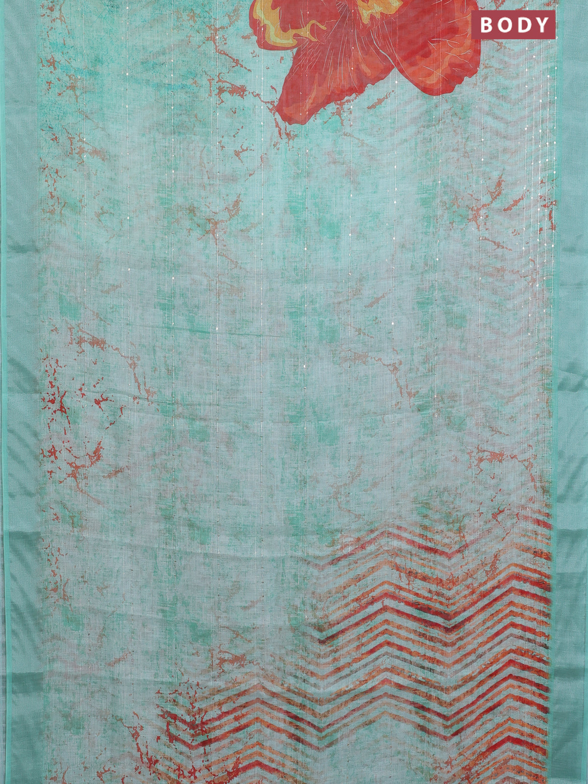 Linen cotton saree teal green with allover prints & sequin work and silver zari woven border