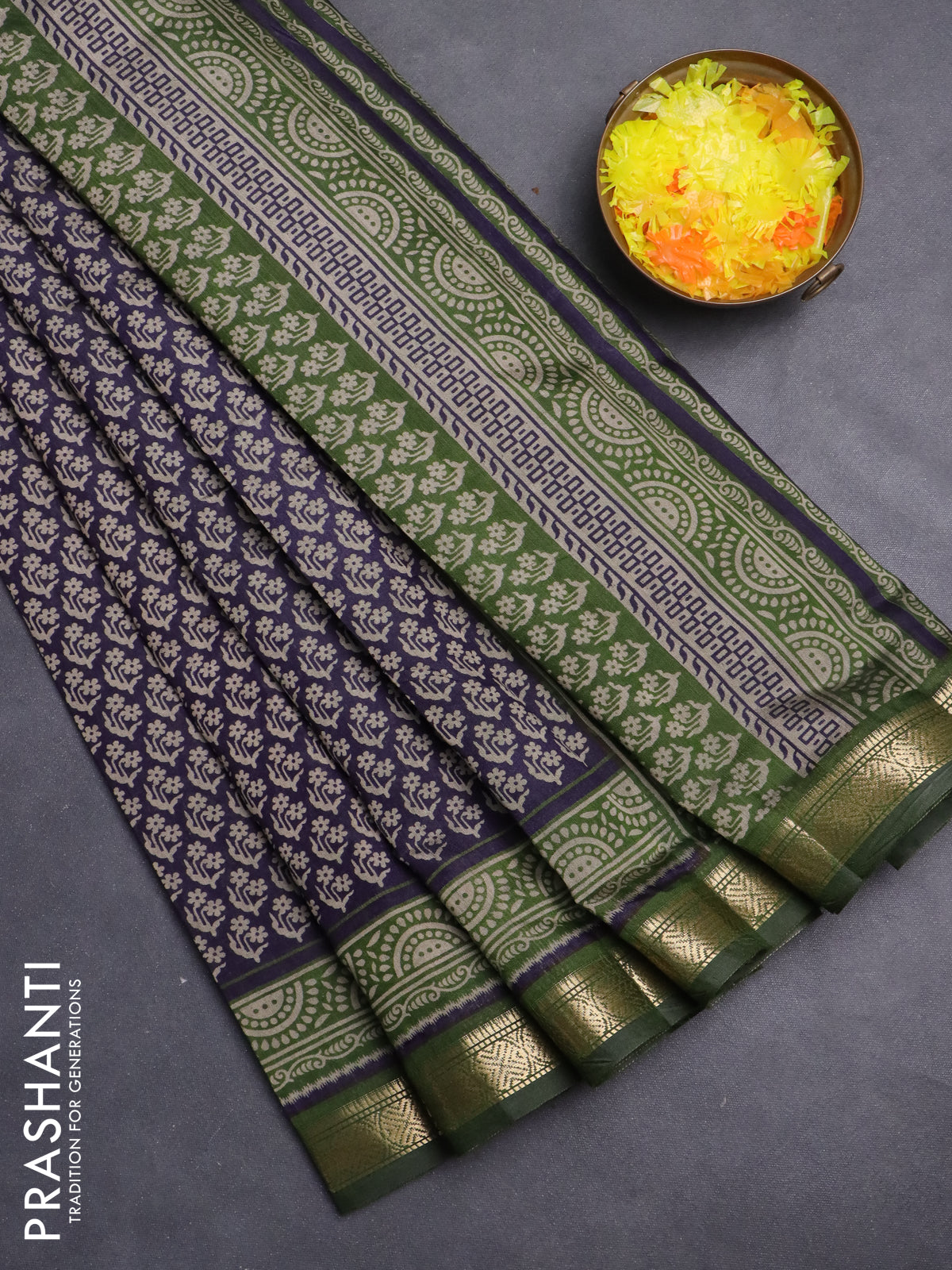 Maheshwari cotton saree navy blue and sap green with allover flower prints and zari woven border
