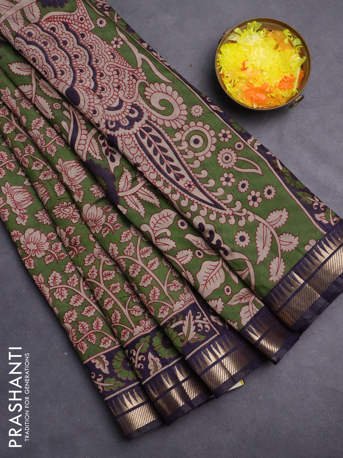 Maheshwari cotton saree sap green and navy blue with allover kalamkari prints and zari woven border