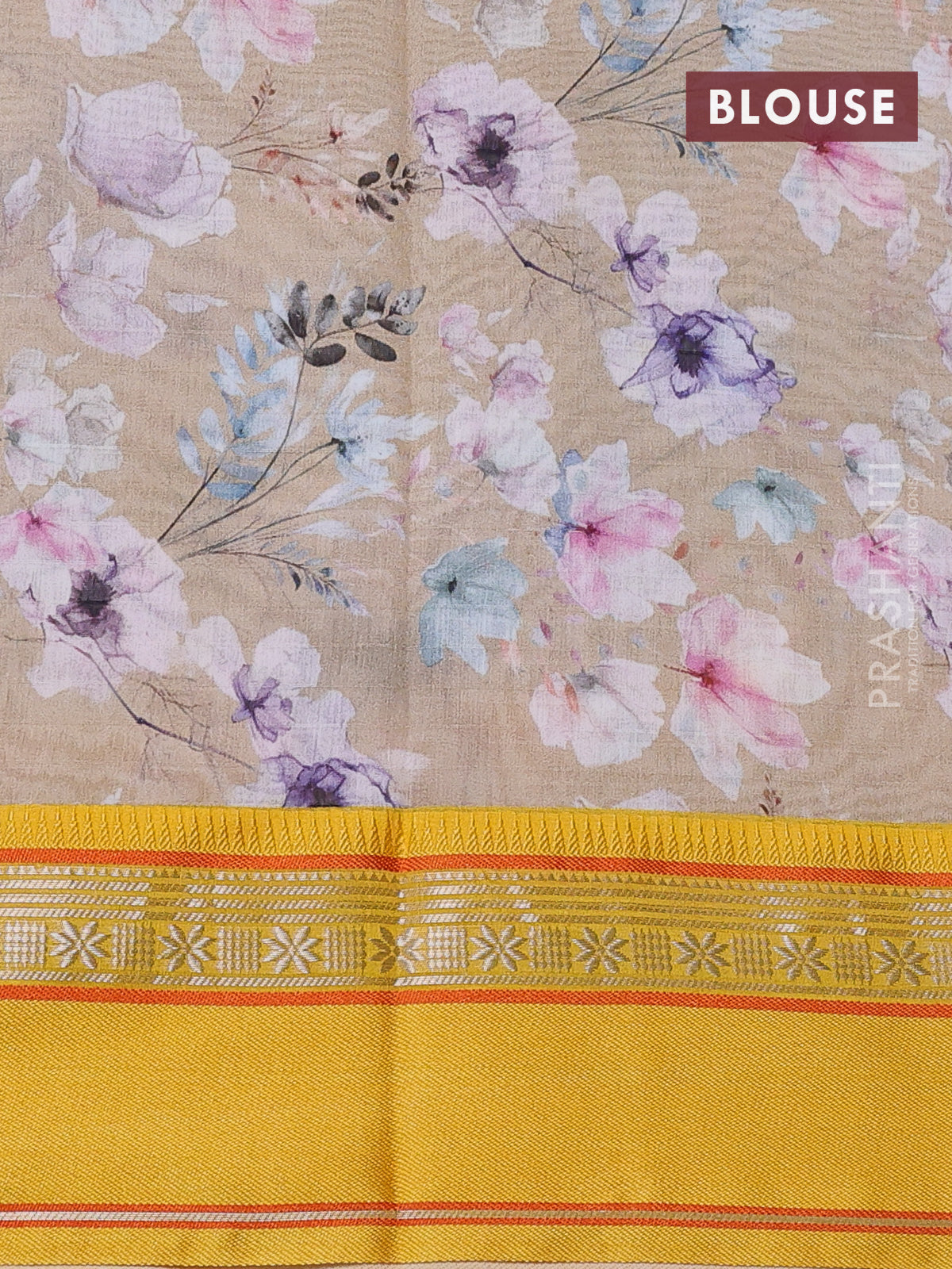 Maheshwari silk cotton saree beige and yellow with allover floral digital prints and rettapet thread woven border