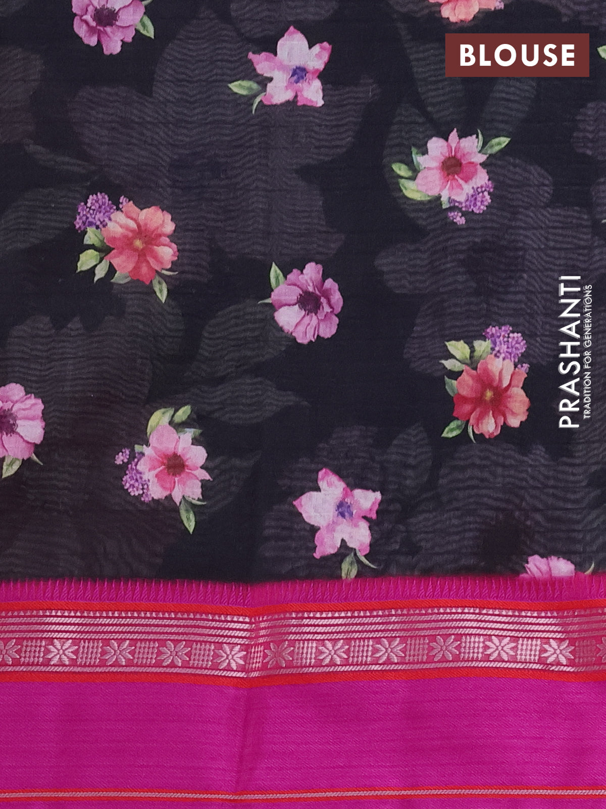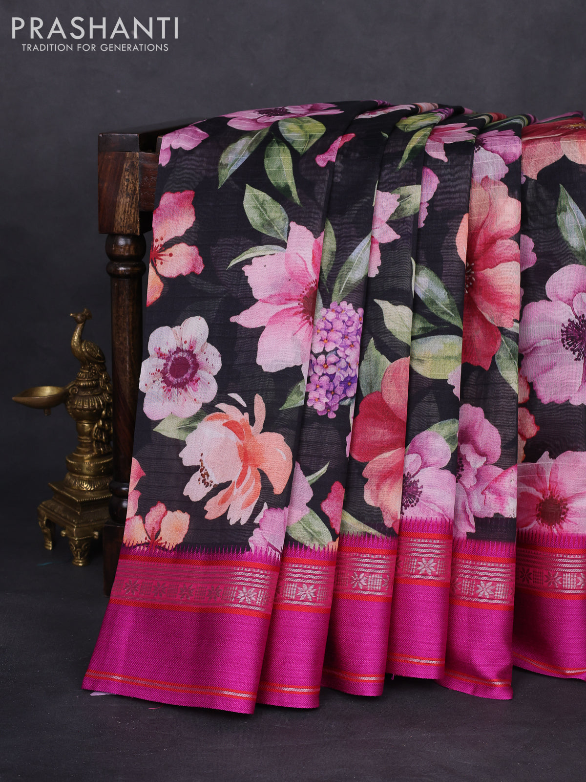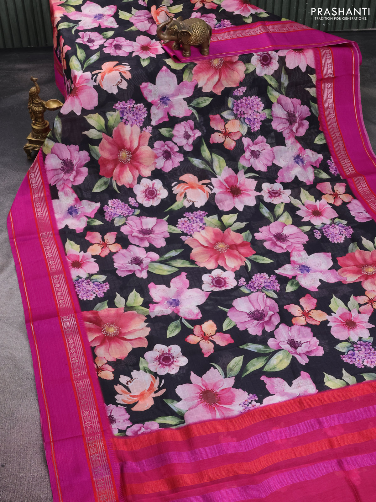 Maheshwari silk cotton saree black and pink with allover floral digital prints and rettapet thread woven border