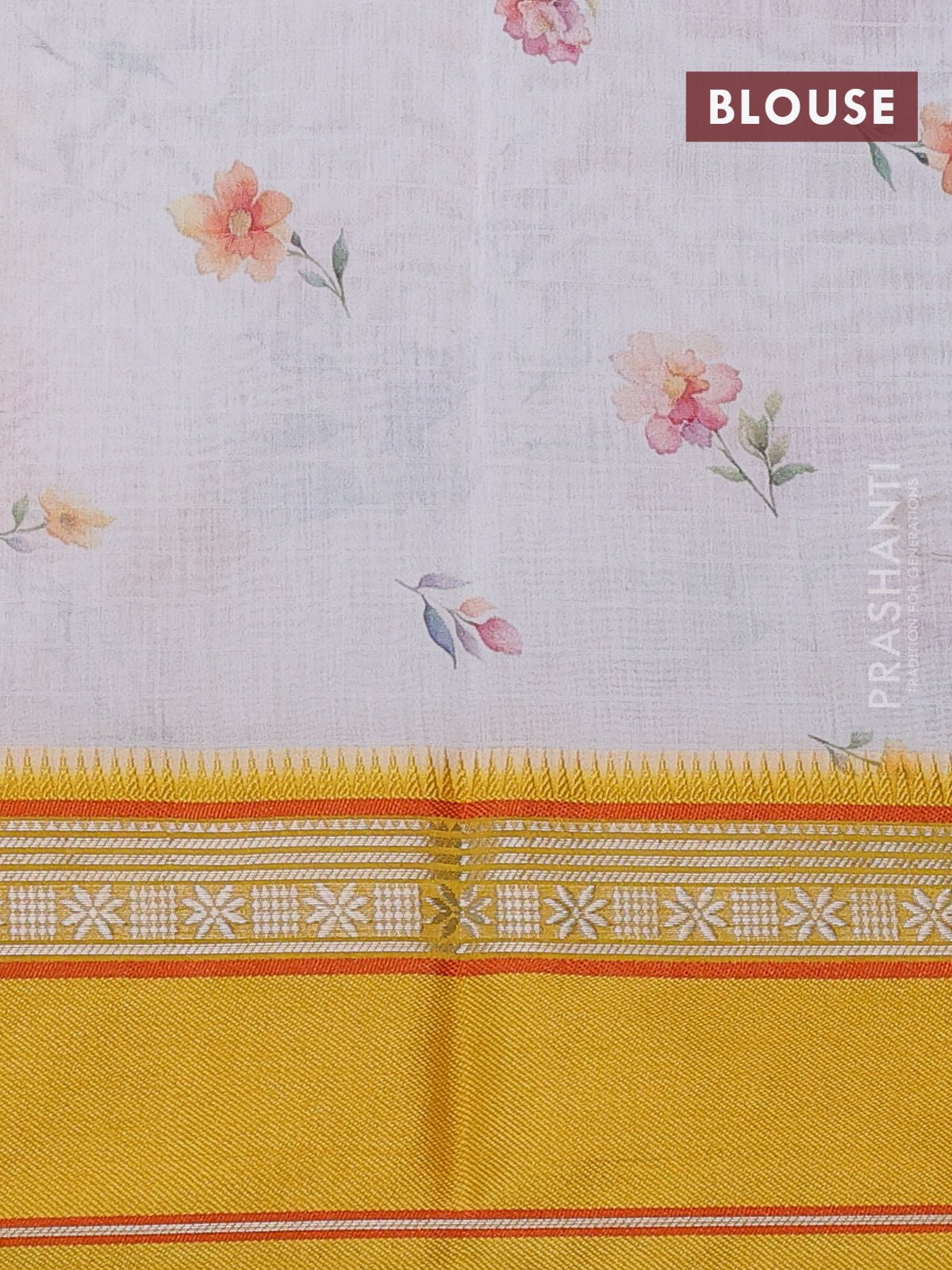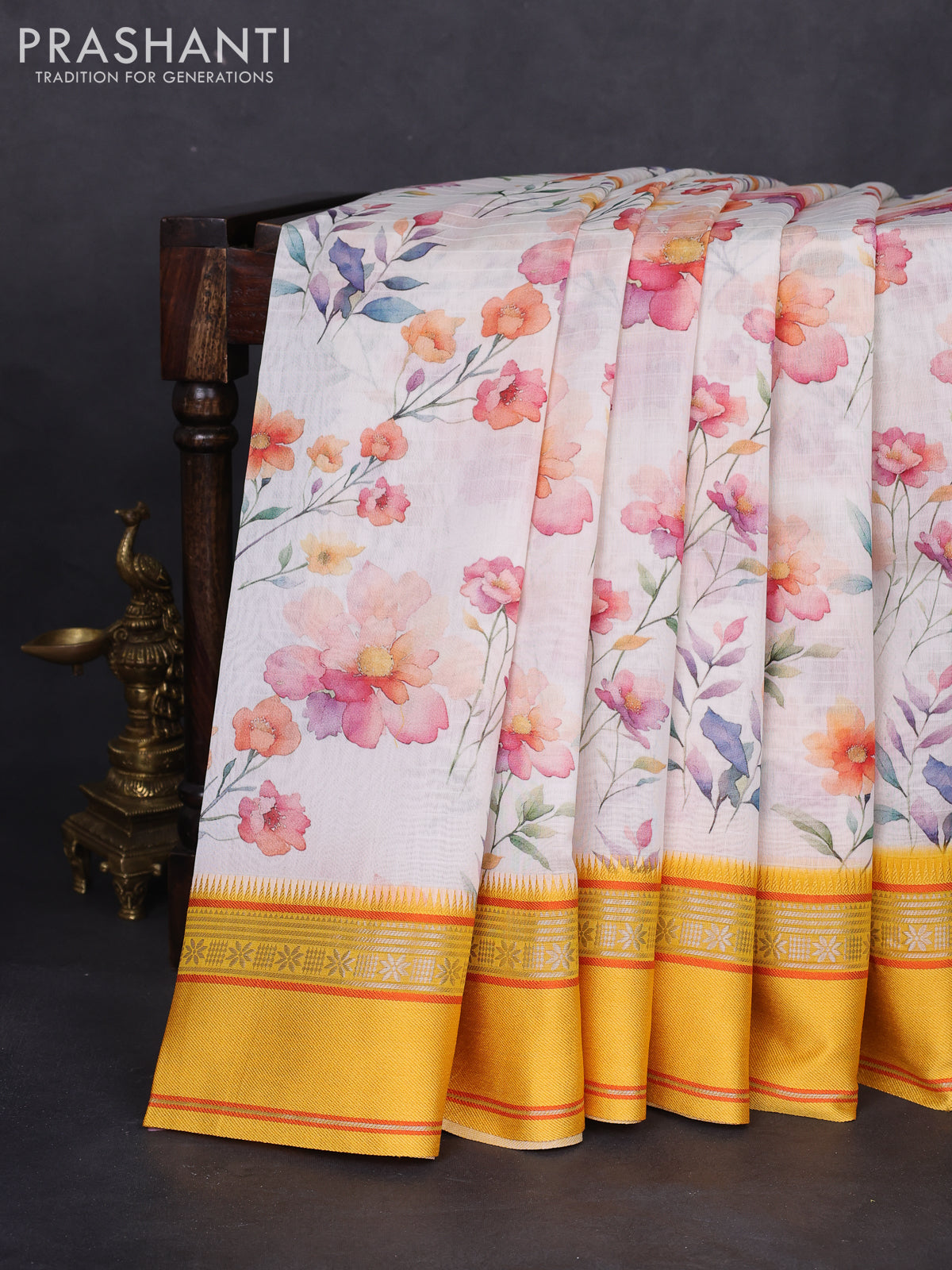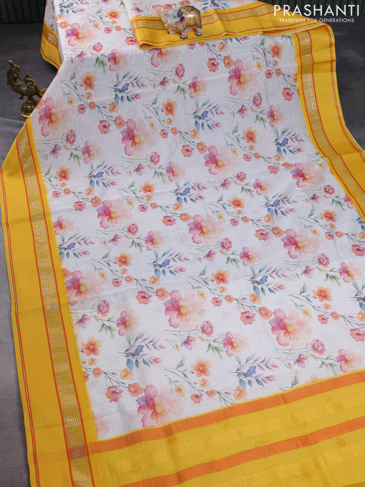 Maheshwari silk cotton saree cream and yellow with allover floral digital prints and rettapet thread woven border