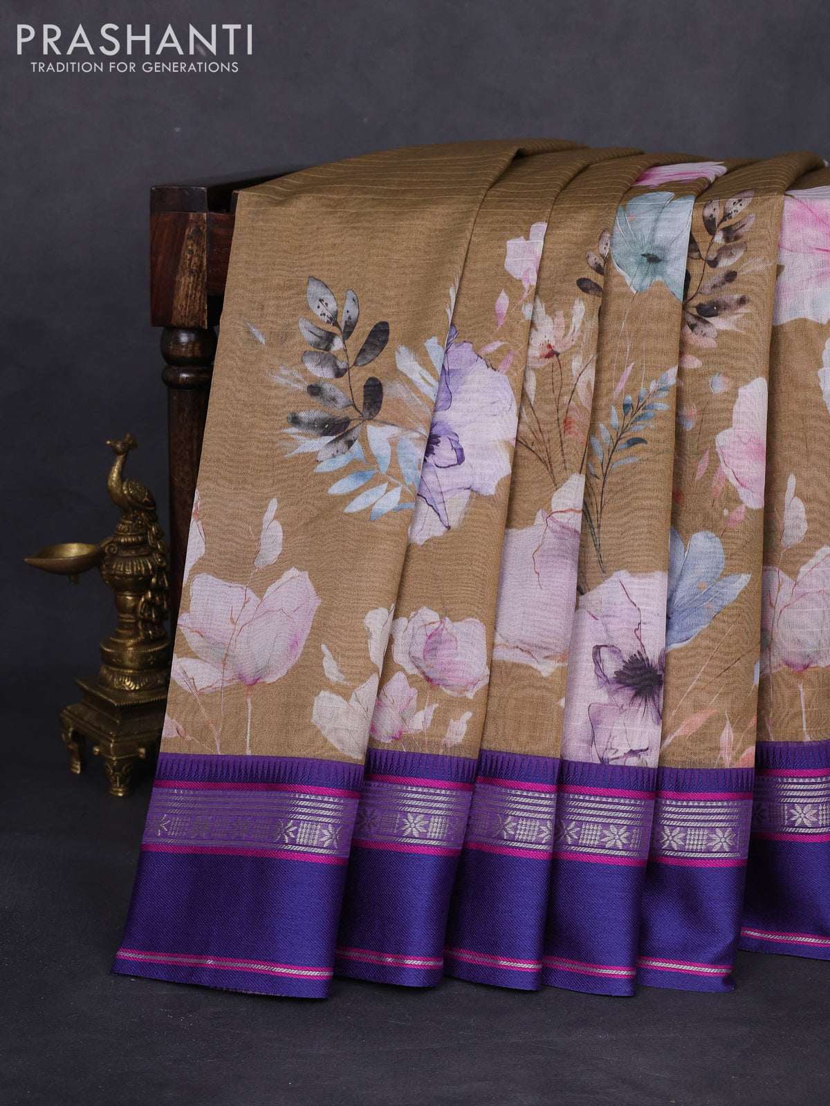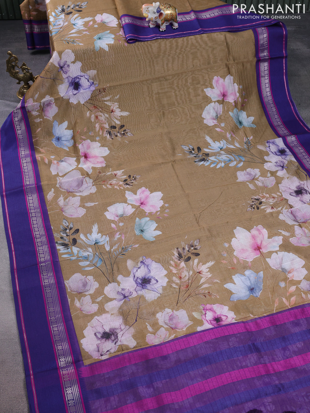 Maheshwari silk cotton saree dark sandal and purple with allover floral digital prints and rettapet thread woven border