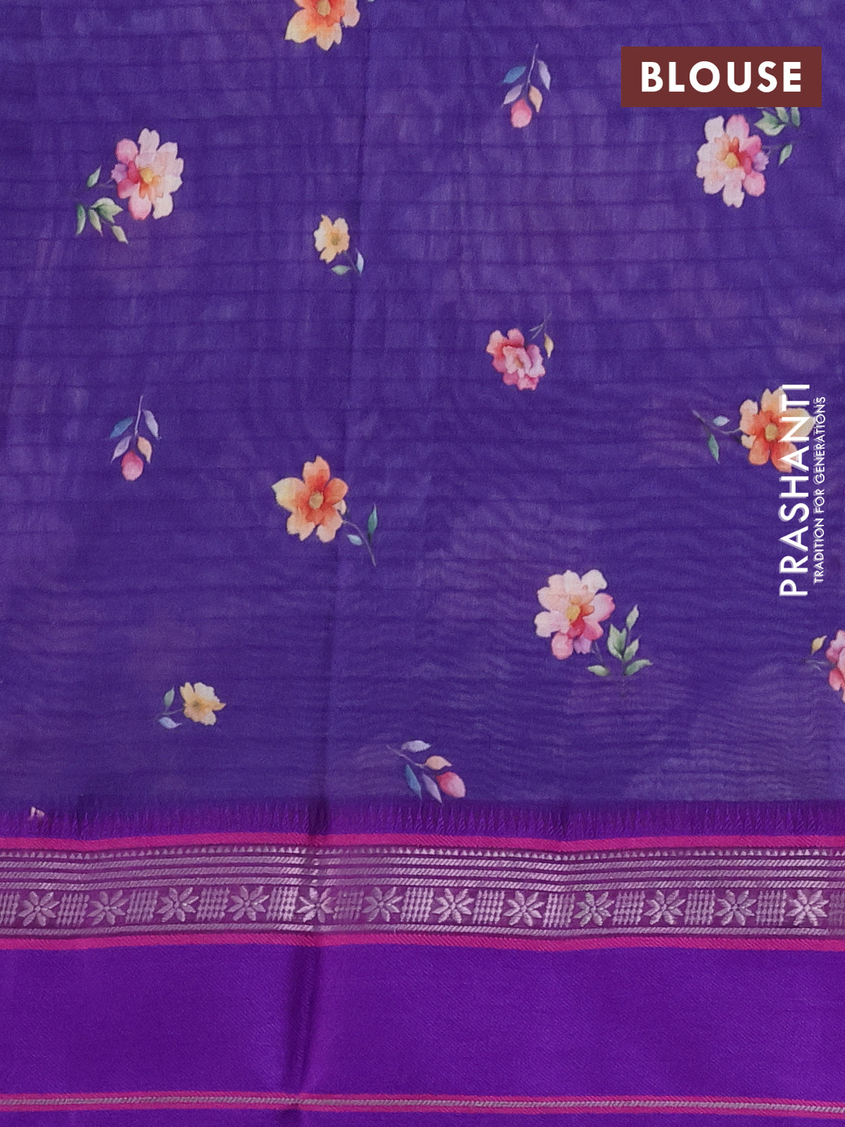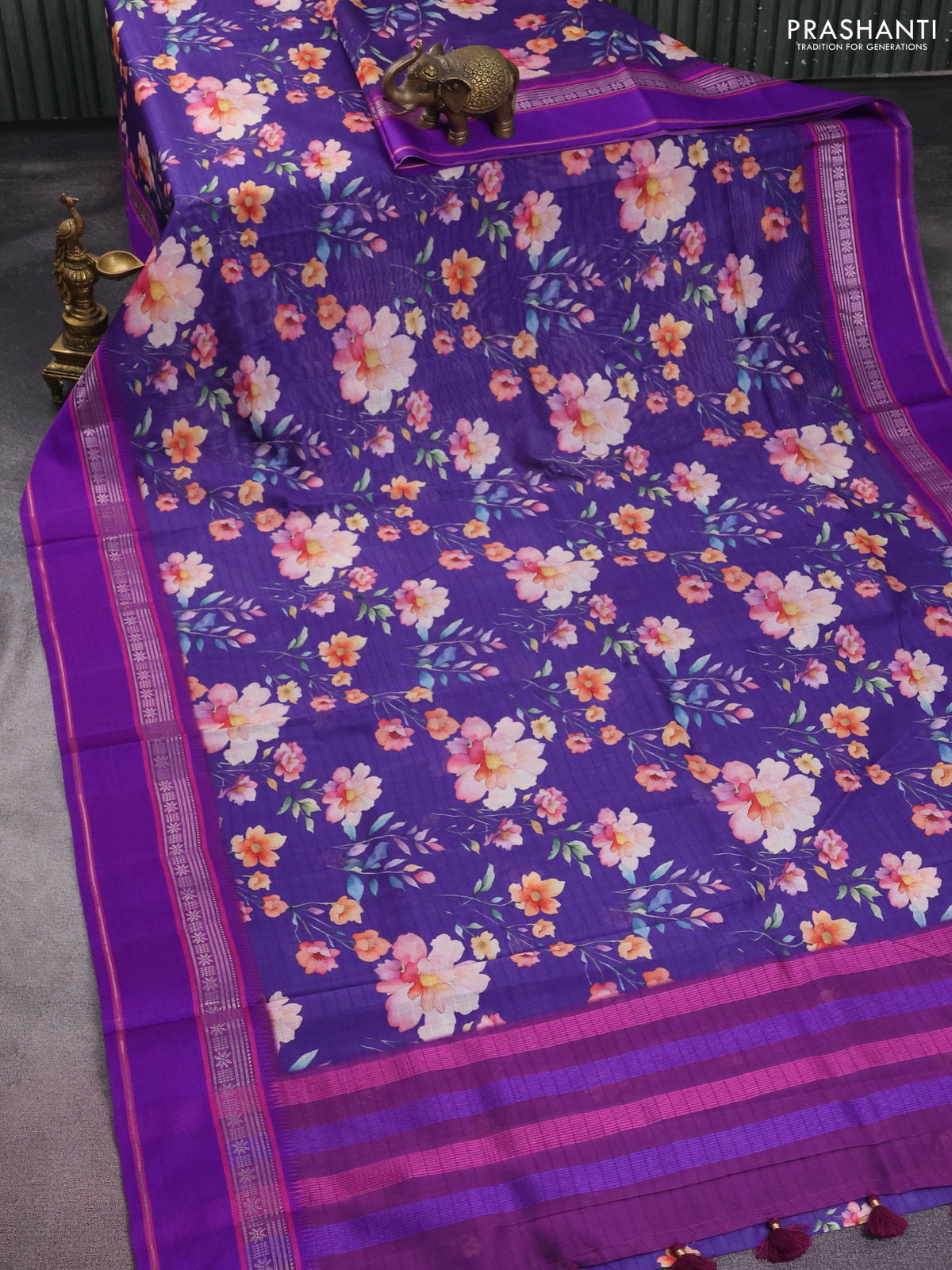Maheshwari silk cotton saree deep violet and purple with allover floral digital prints and rettapet thread woven border